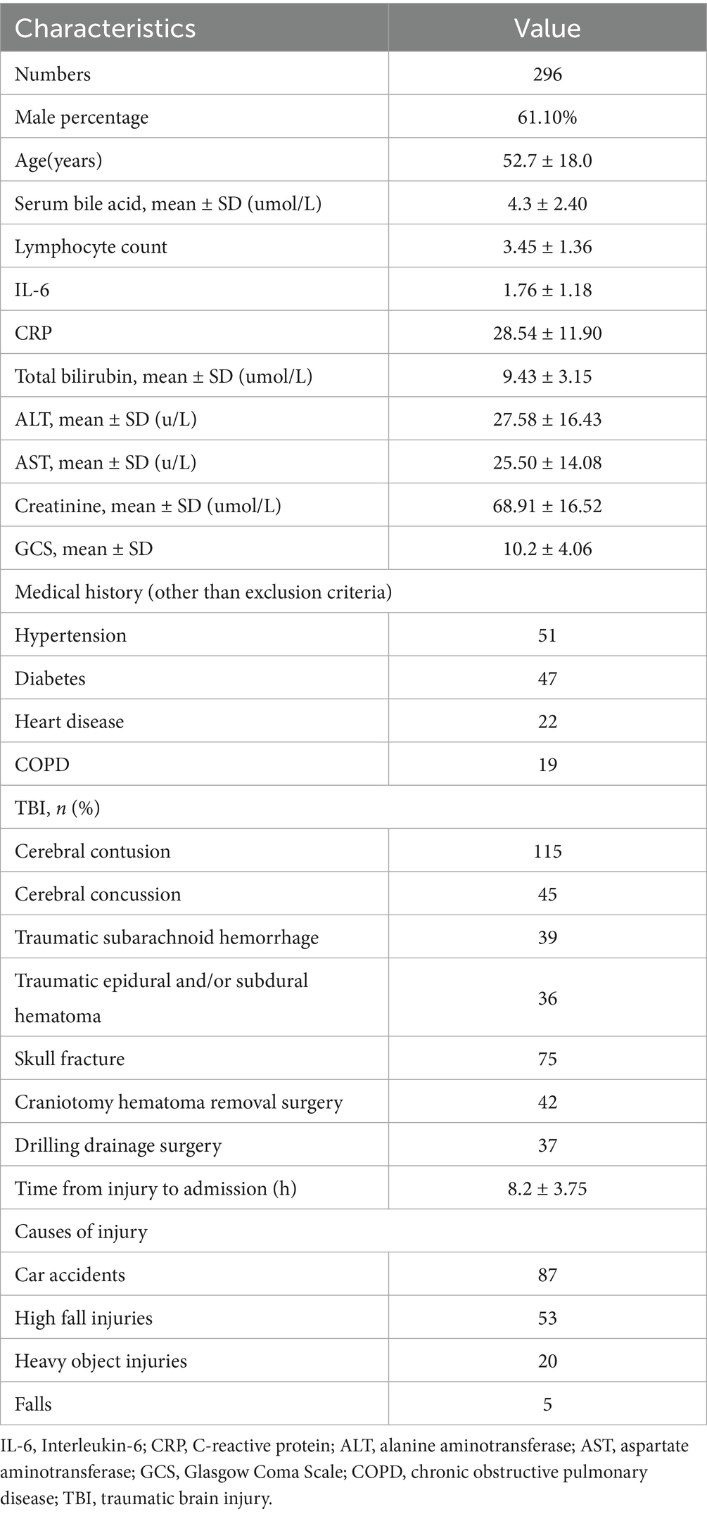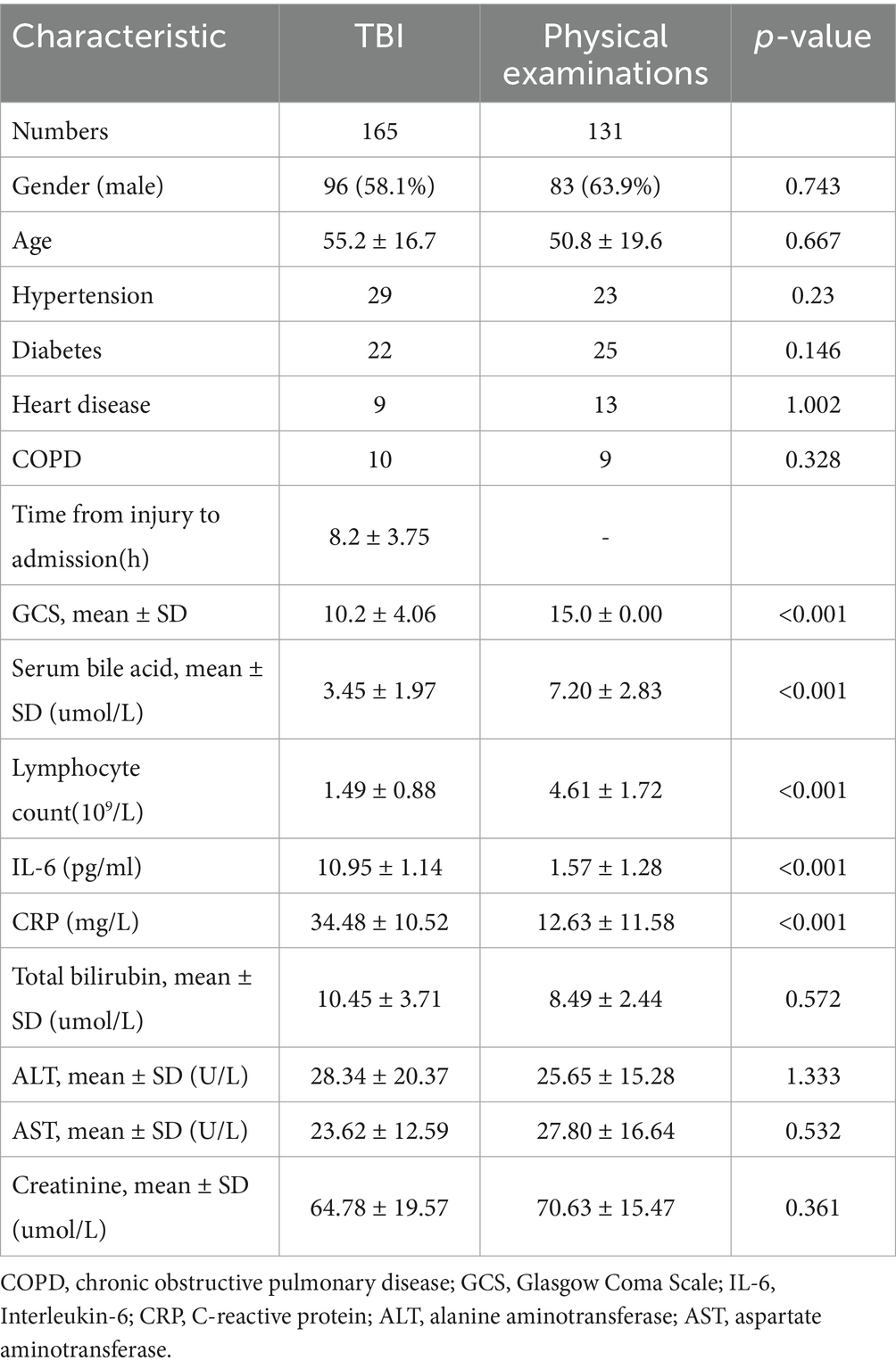 This retrospective study included TBI patients admitted to two medical centers from January 2021 to July 2023 and healthy controls who underwent physical examinations at the medical centers during the same period. TBI was defined by a head Abbreviated Injury Scale (AIS) ≥ 2 or any intracranial hematoma (e.g., cerebral contusion; subarachnoid, subdural, or epidural hemorrhages) seen on head CT scans (14). Inclusion criteria for patients with traumatic brain injury: (1) adults aged 18–75 years old; (2) Meets the diagnostic criteria for traumatic brain injury; (3) The patient received laboratory test results of a standard fasting blood sample upon admission, which should also include indicators such as serum bile acid levels, lymphocyte count, IL-6, and CRP. Exclusion criteria include: (1) patients with combined abdominal injuries, including closed abdominal injuries and open abdominal injuries; (2) History of primary liver, gallbladder, pancreatic, and intestinal obstruction, or history of liver, gallbladder, and gastrointestinal surgery; (3) History of immune system diseases, including immunodeficiency, immunoproliferative diseases, and autoimmune diseases; (4) The patient used steroids or antibiotics 1 month before admission.