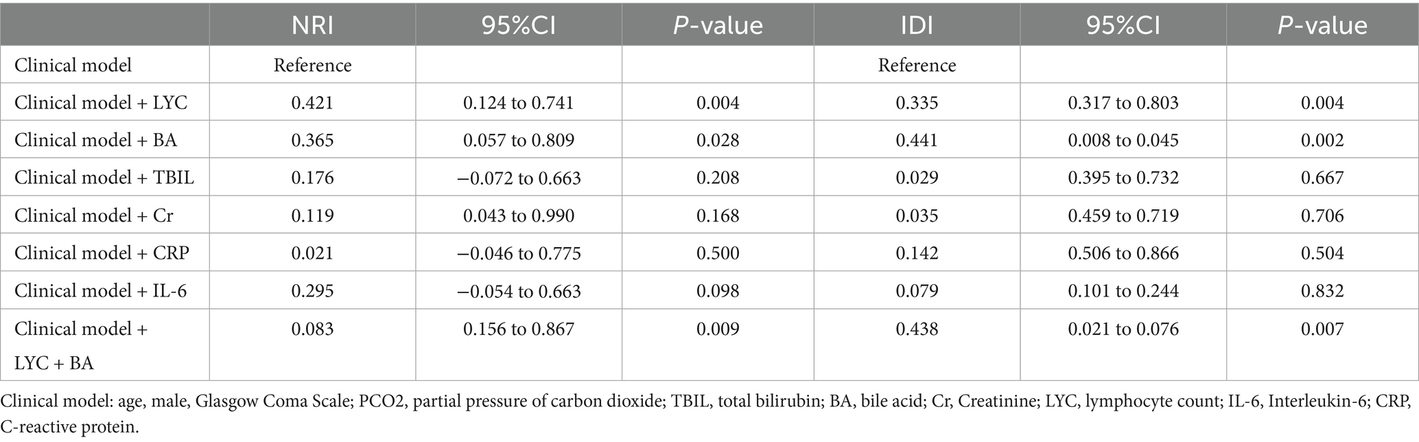 To determine the accuracy of predicting 30 day mortality, the incremental predictive value of lymphocyte count, serum bile acid, and other physiological functional indicators on the basic clinical model (including age, gender, and GCS score) was compared. The groups were compared by comparing Model 1 (basic clinical model: age, gender, GCS at admission), Model 2 (Model 1 + lymphocyte count), Model 3 (Model 1 + total bilirubin), Model 4 (Model 1 + serum bile acids), Model 5 (Model 1 + serum creatinine), Model 6 (Model 1 + C-reactive protein), and Model 7 (Model 1 + interleukin-6). When lymphocyte count is combined with basic clinical models, both net weight classification improvement index (NRI = 0.421, 95% CI: 0.124–0.741, p = 0.004) and comprehensive discriminant improvement index (IDI = 0.335, 95% CI: 0.317–0.803, p = 0.004) show significant improvement in predictive ability; When serum bile acids are used in combination with basic clinical models, both the net weight classification improvement index (NRI = 0.365, 95% CI: 0.057–0.809, p = 0.028) and the comprehensive discriminant improvement index (IDI = 0.441, 95% CI: 0.008–0.045, p = 0.002) show significant improvement in predictive ability. In addition, when lymphocyte count and serum bile acid were combined with clinical models, the net weight classification improvement index (NRI = 0.083, 95% CI: 0.156–0.867, p = 0.009) and comprehensive discrimination improvement index (IDI = 0.438, 95% CI: 0.021–0.076, p = 0.007) both showed significant improvement in predictive ability. The NRI and IDI are shown in Table 4.