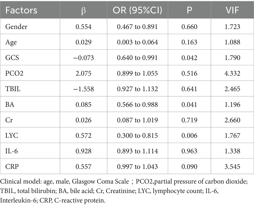 Table 5. Multivariate logistic regression analysis and collinearity diagnosis of 30 day mortality in patients with TBI.