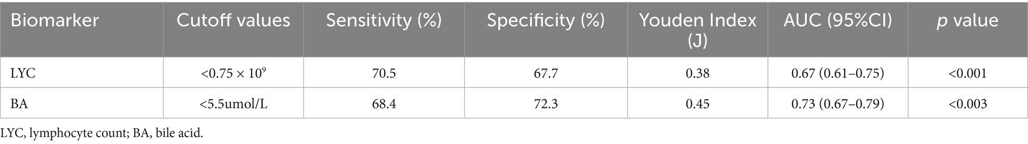For TBI patients, Cutoff values and Youden Index of LYC and BA are shown in Table 6.