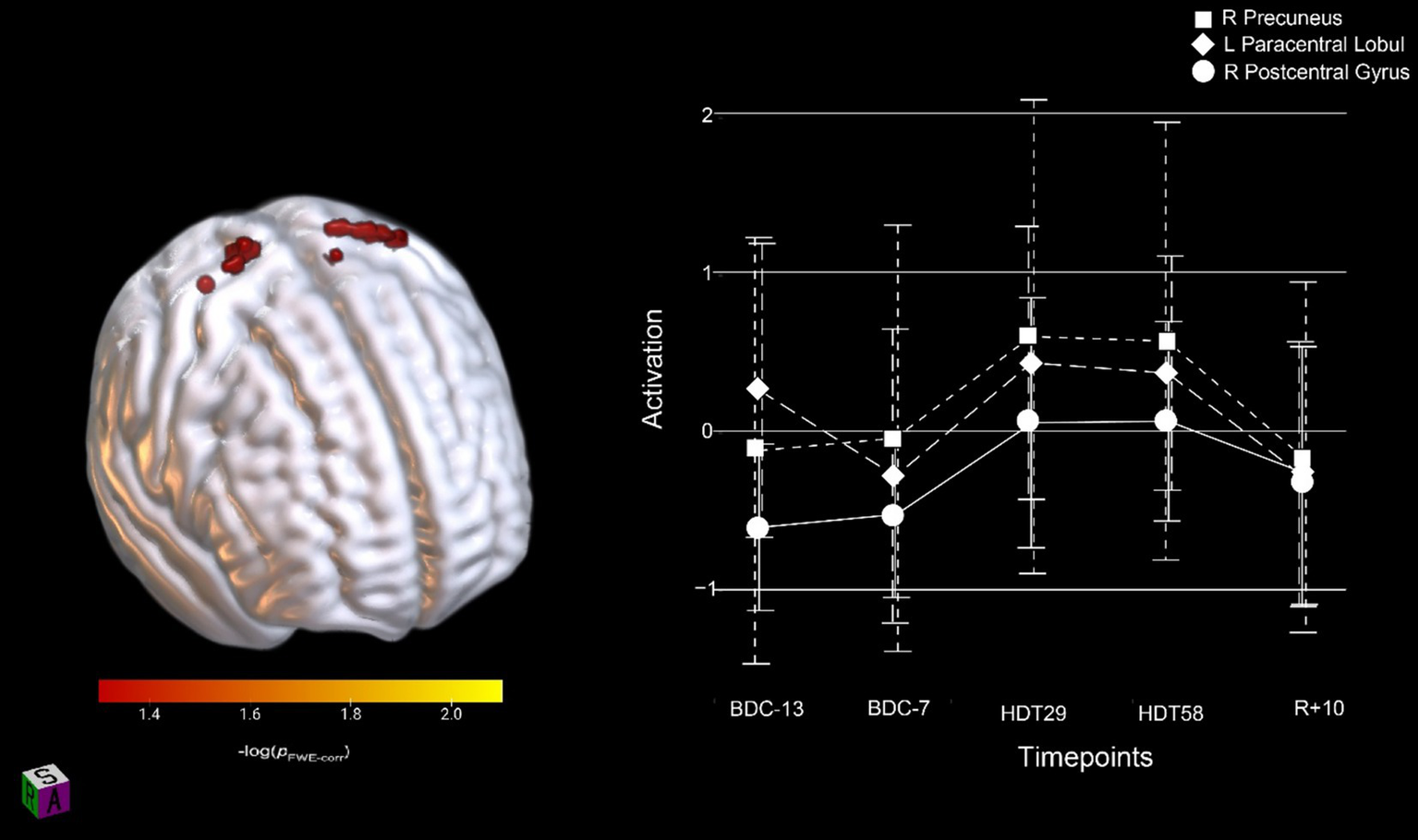 Activation changes across HDBR in all participants during SWM; all participants showed increased activation shortly upon entering HDBR that was maintained throughout HDBR. The activation profile for the right precuneus, left paracentral lobule and right postcentral gyrus regions are shown. Results are overlaid onto the MNI standard template. pFWE-corr, yellower colors represent smaller p-values.