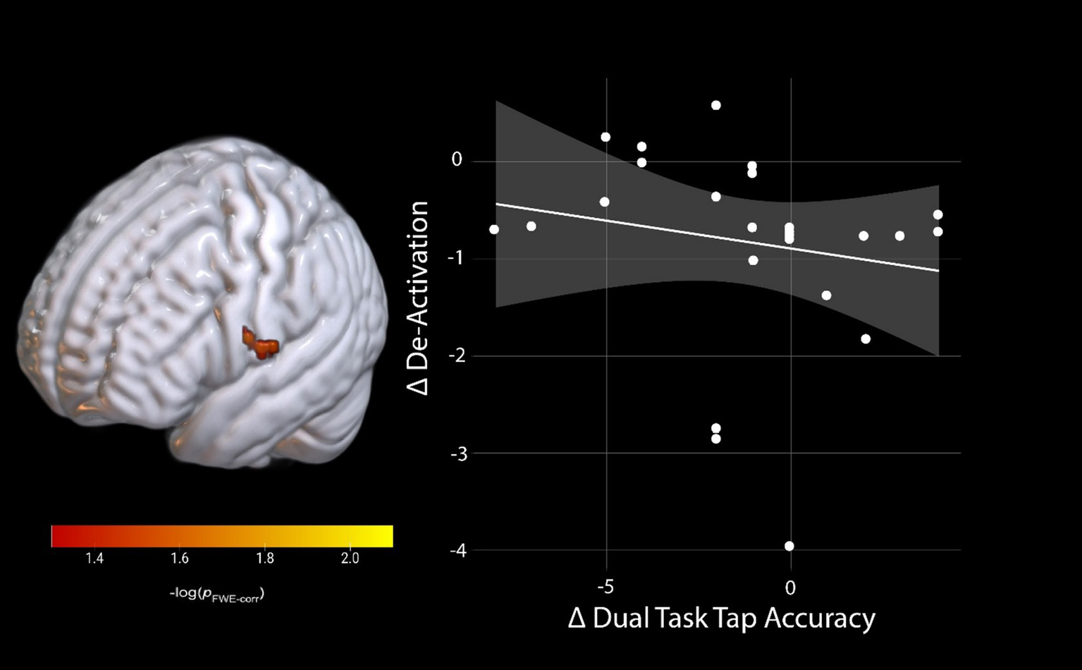 Brain and behavior change-change correlation of dual-task tapping. Change on the De-activation scale indicates a lower activation during late-HDBR compared to pre-HDBR, and change on dual-task tap accuracy scale indicates lower accuracy during late-HDBR compared to pre-HDBR. pFWE-corr, brighter colors represent smaller p-values.