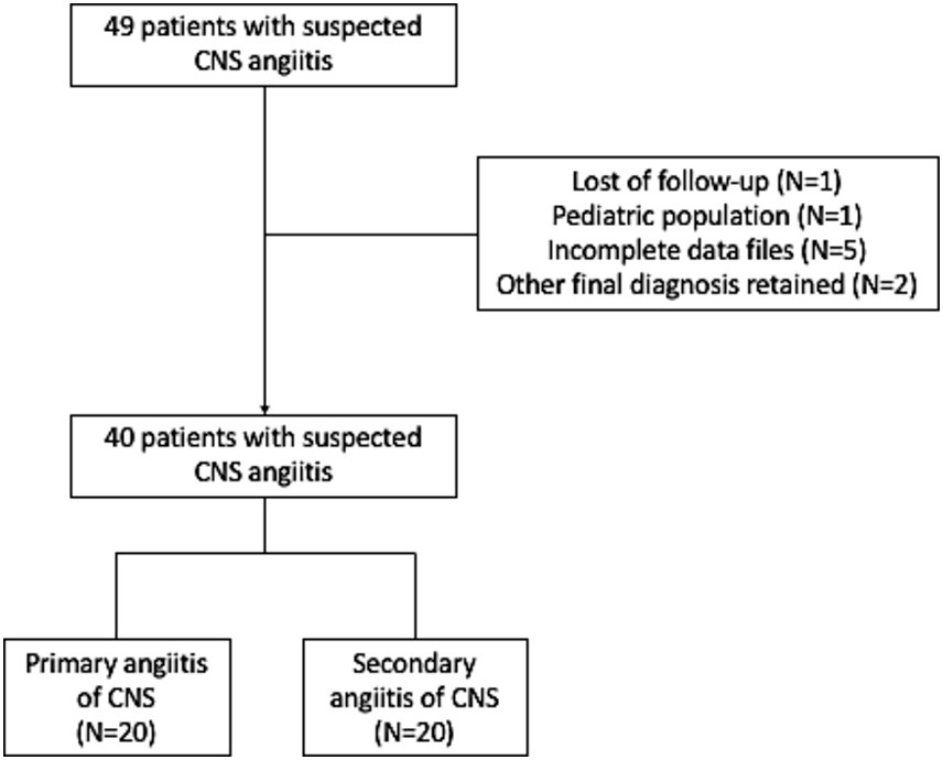 This single center retrospective study was conducted at the tertiary hospital Cliniques Universitaires Saint-Luc in Belgium and approved by the local institutional Ethics committee (CEHF 2023/27JUL/339). All consecutive patients aged over 15 years, with a diagnosis of CNS vasculitis admitted to the Department of Internal Medicine and Neurology between January 2000 and December 2023, were retrospectively identified and reviewed. Data were collected from our institutional database (Epic Systems Corporation, Verona, WI, USA) and the database of the Internal Medicine Department. Inclusion criteria were age of >15-years-old and confirmed CNSV. The diagnosis of PACNS was based on the Calabrese and Mallek criteria (11) encompassing the presence of an unexplained acquired neurologic deficit after extensive investigation for other causes, evidence of an inflammatory arteritic process within the CNS by either angiography and/or histopathological examination without any underlying systemic disorder. In addition, we also assessed the diagnosis according to Birnbaum and Hellmann’s criteria (12) Secondary CNS vasculitis was defined as secondary involvement of the CNS as part of a systemic vasculitis due to an infectious process, a systemic inflammatory disorder, malignancy, toxin/drug exposure, radiation, or other identifiable etiologies (20).