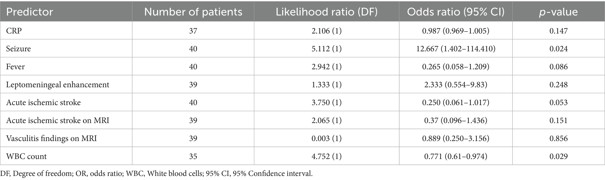 Univariate logistic analysis to assess the association between clinical findings and PACNS diagnosis showed that seizures (odds ratio [OR] of 12.667 [1.402–114.410], p = 0.024), as well as low serum WBC count (OR 0.771 [0.61–0.974], p = 0.029) at the diagnosis were associated with PACNS diagnosis (Table 2).