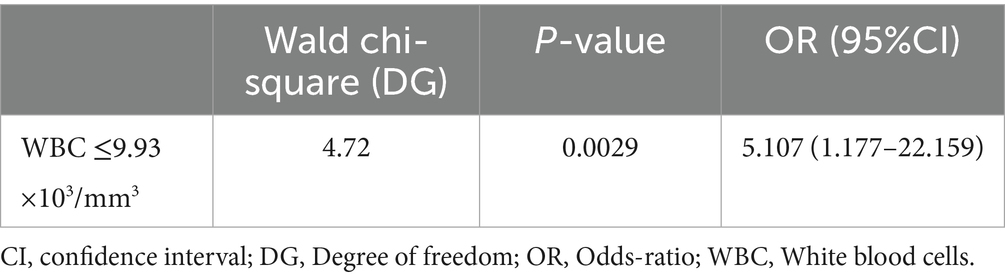 ROC curve identified a WBC count cut-off of 9.93 × 103/mm3 (Area Under the Curve of 0.719 [p = 0.01], accuracy for the corresponding Youden index of 0.36 with 75% sensitivity and 61% specificity) for the prediction of PACNS (Table 3). In multivariate analysis, a serum WBC count lower than the threshold was an independent predictor of PACNS with an OR of 5.107 (p = 0.029) [1.177–22.159].