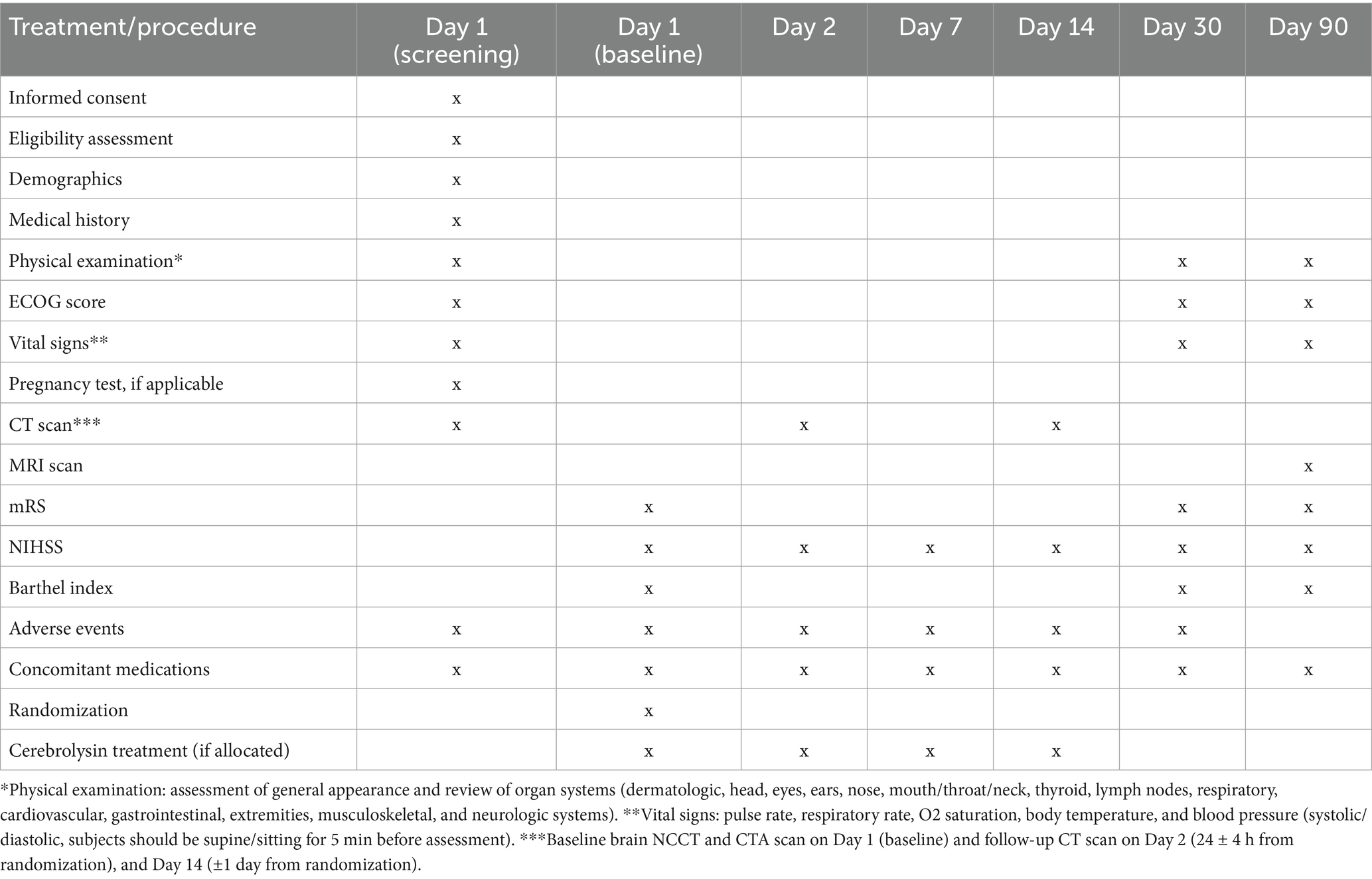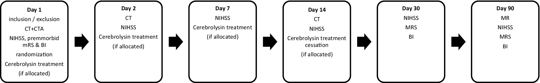 The baseline brain NCCT and CTA will be completed on Day 1 (baseline) and the follow-up CT scan on Day 2 (24 ± 4 h from randomization) and day 14 ± 1 right after treatment termination. This will allow to assess the evolution of swelling which also reflects the status of blood–brain barrier permeability. The magnetic resonance imaging (MRI) scan will be completed on Day 90 ± 7 (41).