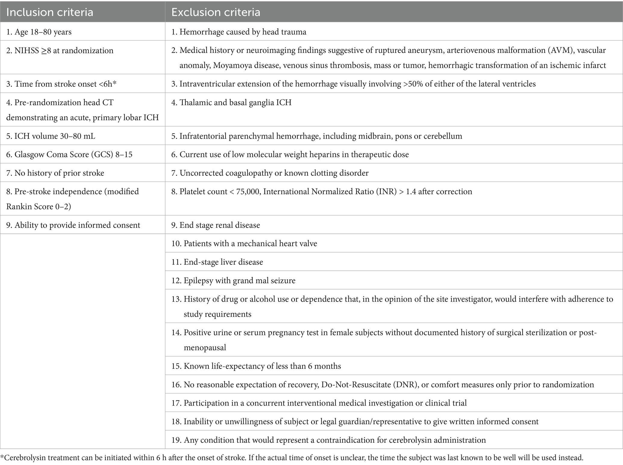 Two trials have previously assessed cerebrolysin’s efficacy and safety in ICH. The first one demonstrating no effect after a 10-day treatment course. From the current perspective, those results must be reassessed due to several methodological limitations and advances in stroke care standards. The trial was conducted at a single center and enrolled patients with basal ganglia hematomas in whom neuroprotective and neuroregenerative effects are inherently challenging to demonstrate. The outcome measures were non-standard compared to those used generally for reporting stroke outcomes. Long-term outcomes were not reported, and the intervention did not involve early intensive rehabilitation (important for benefit from the synergistic effect of cerebrolysin and rehabilitation) and was initiated in a 6- to 24-h time window (38). This could also have affected the neutral outcome, as hematoma growth occurs mainly within 6 h of symptom onset (39). Another recent study showed a positive effect of cerebrolysion on functional outcome measured on the modified Rankin Scale (mRS) and Barthel Index and also reduced 6-month mortality (40) dose used in these patients was 30 mL daily over 21 days. Time from onset to needle was predefined as 12 h, nevertheless the patients were treated beyond 13 h of onset and less than 40% experienced lobar ICH.