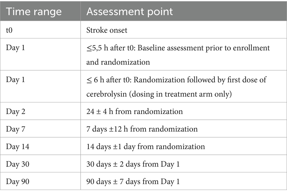 The 6-h treatment window was selected based on the temporal profile of hematoma expansion in primary ICH, balancing (i) practical feasibility of patient identification, consent, and randomization; (ii) opportunity to affect hematoma expansion, which is the key determinant of functional outcome; (iii) 4- to 6-h therapeutic window for traumatic brain injury; and (iv) 8-h time window in the cerebrolysin thrombectomy trials.