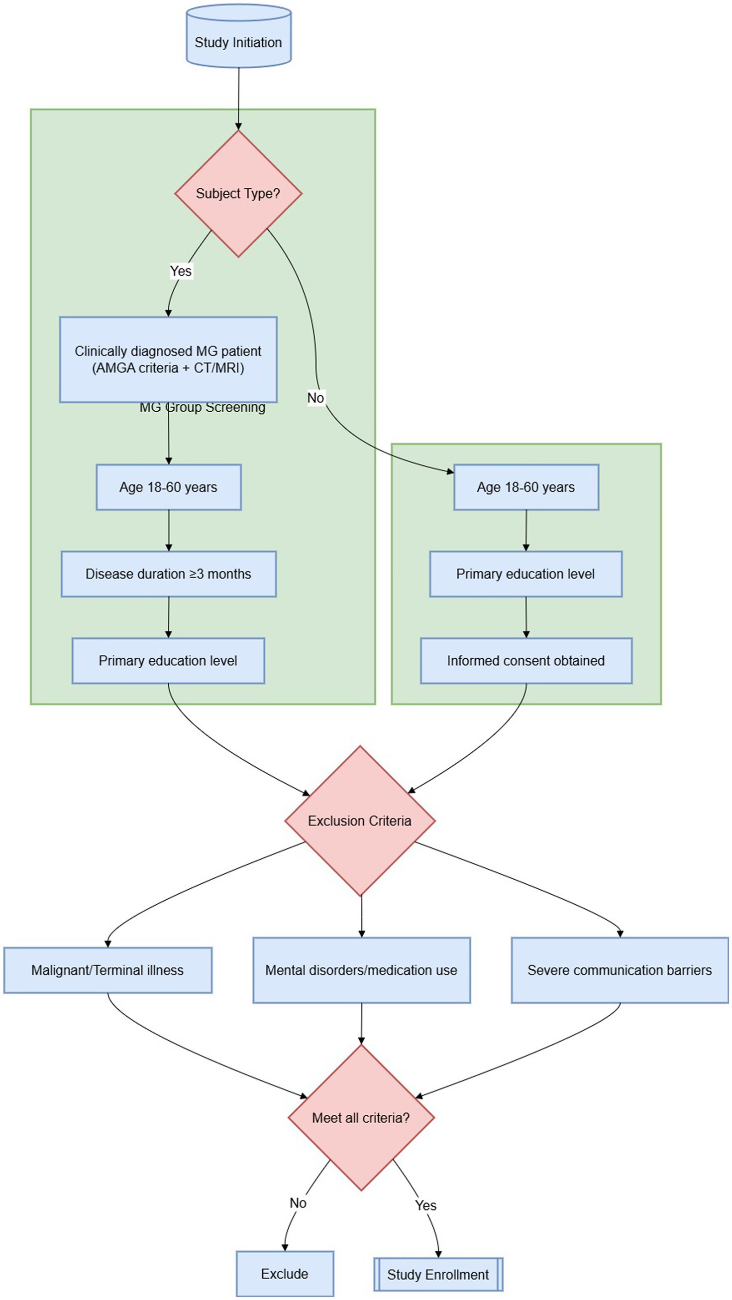Using convenience sampling, we selected MG patients who attended follow-up visits at the neurology and thoracic surgery outpatient departments of a tertiary hospital in Shenzhen between January 2020 and December 2022 (hereafter referred to as the “MG group”). A control group (“non-MG group”) was established by recruiting individuals without MG who underwent physical examinations at the same hospital during the same period. The inclusion and exclusion criteria were designed to ensure comparability between groups while minimizing confounding factors.
