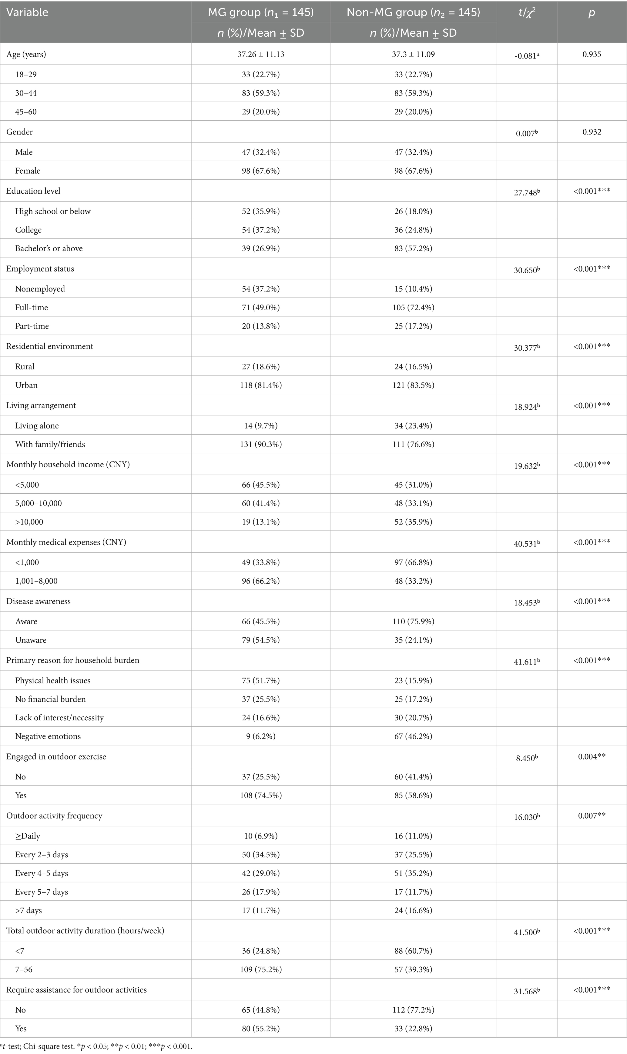 In the MG group, 151 questionnaires were distributed, and 145 valid questionnaires were collected, yielding an effective response rate of 96.0%. In the non-MG group, 155 questionnaires were distributed, and 145 valid questionnaires were collected, yielding an effective response rate of 93.5%. A comparison of the general characteristics between the two groups revealed no statistically significant differences in age or sex composition (p > 0.05). However, significant differences were observed between the groups in terms of educational level, employment status, occupation, residence, living conditions, per capita monthly household income (Yuan), method of payment for medical expenses, monthly medical expenditure (Yuan), understanding of one’s own disease, primary reasons for limitations in undertaking household responsibilities, engagement in outdoor exercise, frequency of outdoor activities, total duration of outdoor activities (hours per week), and whether assistance was required for outdoor activities (p < 0.05; Table 1).