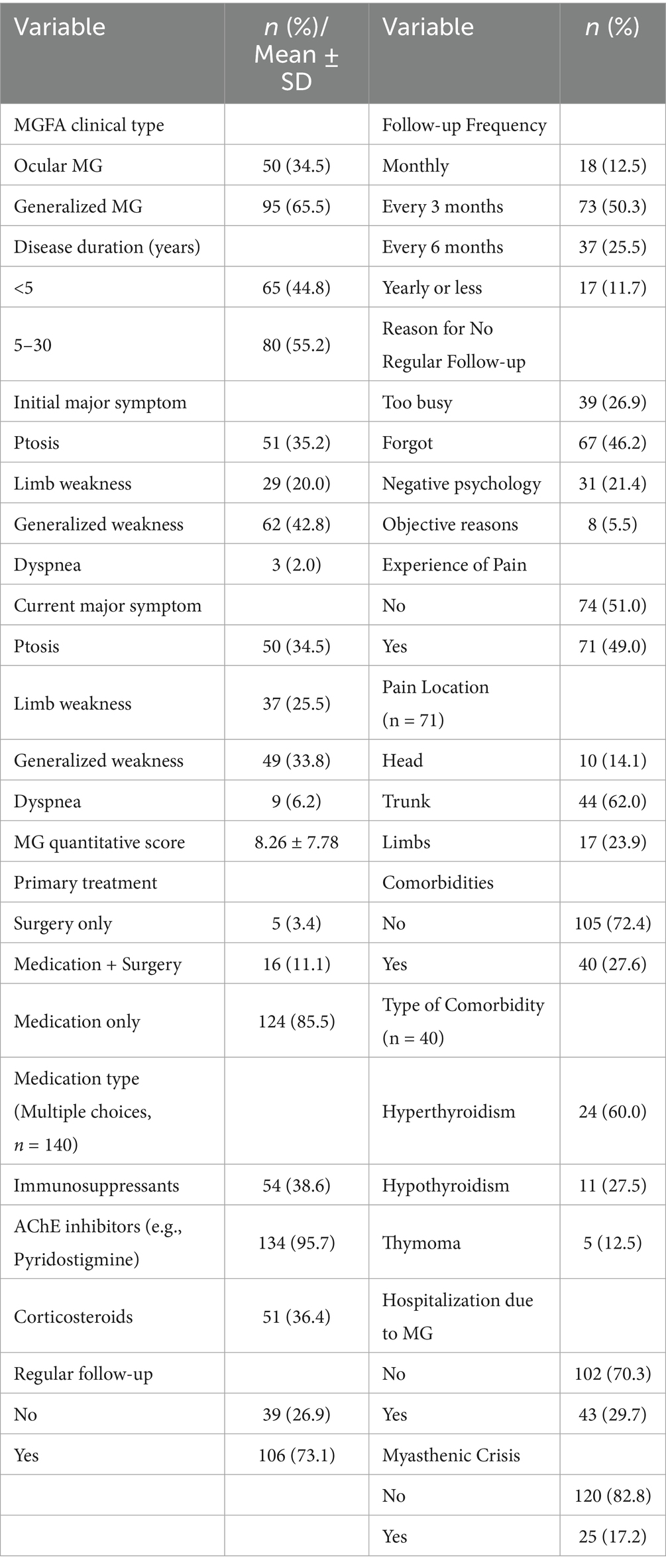 This study included a total of 145 young and middle-aged MG patients. Among them, 65.5% were classified as having generalized myasthenia gravis, and 55.2% had a disease course exceeding 5 years. The predominant initial symptoms at diagnosis were ptosis (35.2%) and generalized weakness (42.8%). Similarly, the current primary symptoms remained ptosis (34.5%) and generalized weakness (33.8%). The mean Myasthenia Gravis Quantitative Score (MGQS) was 8.26 ± 7.78. Pharmacological treatment was administered to 96.6% of patients, with 95.7% receiving acetylcholinesterase inhibitors (e.g., pyridostigmine). Regarding follow-up, 73.1% attended regular visits, with 50.3% having appointments every 3 months. The main reason for irregular follow-up was forgetfulness (46.2%). Nearly half of the patients (49.0%) reported experiencing pain, primarily located in the trunk (62.0%). Comorbidities were present in 27.6% of patients, with thyroid disorders being the most common (87.5%). Additionally, 29.7% had been hospitalized due to MG, and 17.2% had experienced a myasthenic crisis. Details are provided in Table 2.
