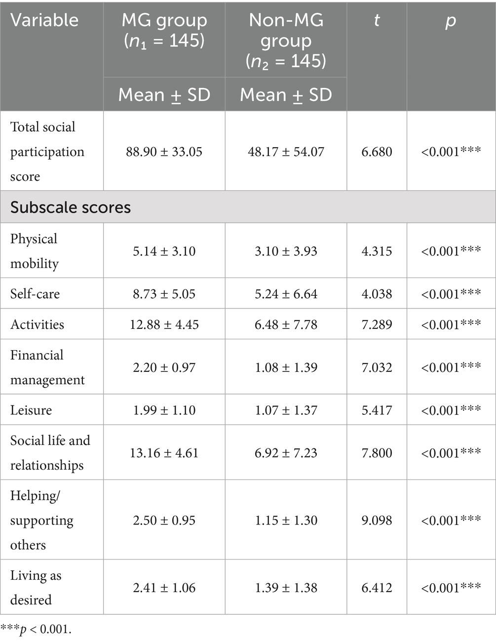 The results indicated that the MG group had significantly higher scores in overall social participation across all dimensions than did the non-MG group (p < 0.05) (Table 3).