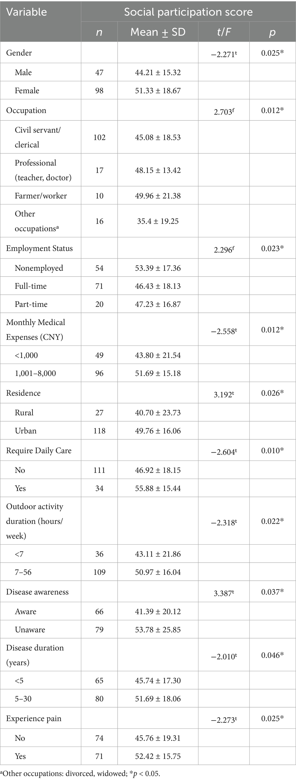 Univariate analysis revealed statistically significant differences in social participation scores based on sex, occupation, employment status, monthly medical expenditure (in yuan), place of residence, whether daily care is needed, total duration of outdoor activities (hours per week), level of understanding of one’s own disease, disease duration (in years), and the presence of pain (p < 0.05; Table 4).