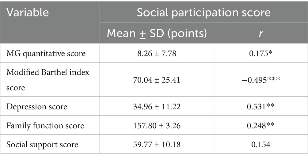 Correlation analysis revealed that the MG quantitative score, depression score, and family function score were significantly positively correlated with the social participation score (p < 0.05). In contrast, the modified Barthel index score was significantly negatively correlated with the social participation score (p < 0.001; Table 5).