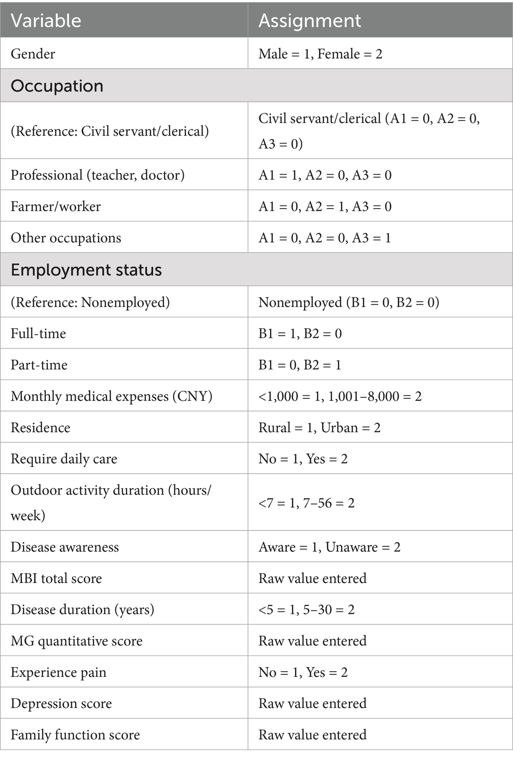① Patients meeting the clinical classification criteria of the American Myasthenia Gravis Association and the Myasthenia Gravis Quantitative Score (MGS), as well as CT and MRI examination standards, with a confirmed clinical diagnosis of MG and an MGS ranging from 0 to 26 (4). The MGS range of 0–26 was selected to include patients with mild to moderate disease severity, ensuring that participants retained sufficient cognitive and communicative abilities to complete the questionnaires reliably. This range excludes only the most severe cases (MGS > 26), which are often associated with critical impairment and may not be representative of the broader MG population in social participation studies.