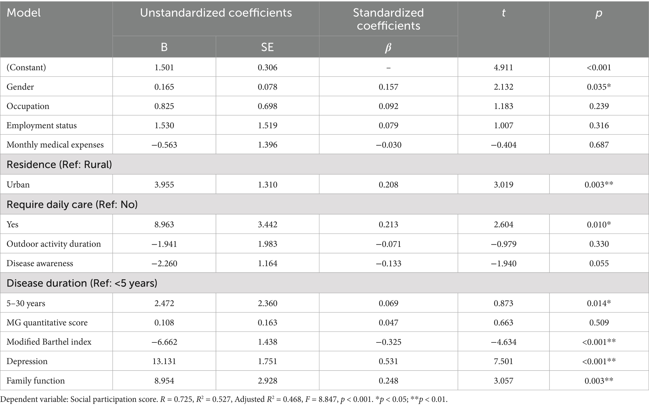 This study provides comprehensive insights into the social participation of young and middle-aged patients with MG and its influencing factors. Our results demonstrate that this population experiences significantly impaired social participation, with a total score of 88.90 ± 33.05 indicating low engagement levels. Based on the standardized regression coefficients (β values) from our multiple linear regression analysis, depressive symptoms (β = 0.531, p < 0.001) emerged as the strongest predictor of impaired social participation, followed by daily activity ability as measured by the modified Barthel Index (β = −0.325, p < 0.001). Family functioning (β = 0.248, p = 0.003) and urban residence (β = 0.208, p = 0.003) also demonstrated substantial effects, while the need for daily care showed a moderate effect (β = 0.213, p = 0.010). Gender (β = 0.157, p = 0.035) and disease duration (β = 0.069, p = 0.014) had smaller but statistically significant effects (37). The strong impact of depression underscores its central role in limiting social engagement, potentially due to its effects on motivation, energy levels, and self-perception. The significant contribution of physical functioning highlights the importance of addressing mobility and self-care limitations to facilitate social participation. These findings suggest that interventions targeting both psychological well-being and physical functioning may have the greatest potential to improve social participation outcomes in this population.