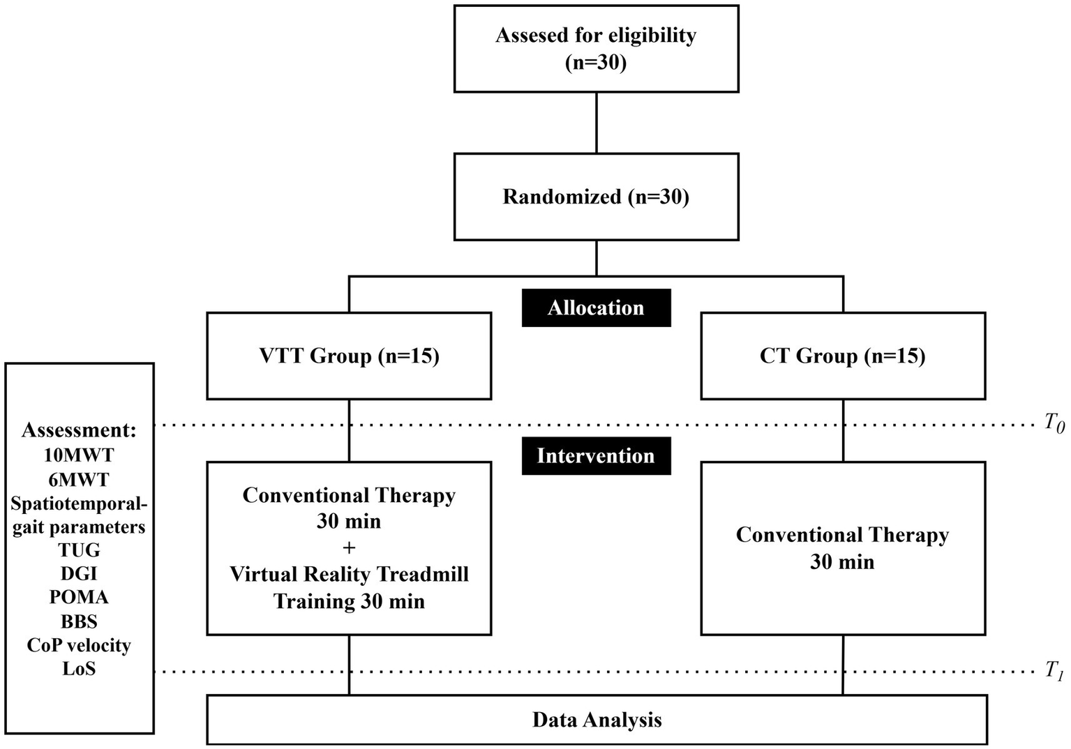 After randomization, all participants underwent a baseline assessment prior to the intervention. Both groups received training sessions twice per week for 6 weeks for a total of 12 sessions. The CT group received 30 min of conventional rehabilitation therapy focused on gait and balance. In contrast, the VTT group received the same 30-min conventional therapy, then an additional 30-min VR-based treadmill training session. In the VTT group, the sequence of conventional therapy and VR treadmill training was allowed to vary across sessions, as the order was not considered to affect the therapeutic outcomes.