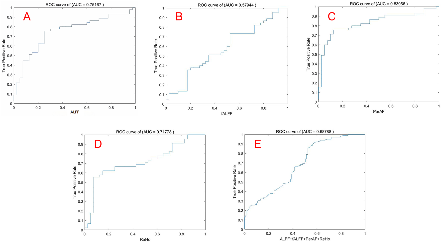The ROC curve was used to evaluate the performance of the four indicators by SVM. Note: (A) ALFF; (B) fALFF; (C) PerAF; (D) ReHo; (E) Combination of ALFF, fALFF, PerAF, ReHo. ROC, Receiver operating characteristic; SVM, Support vector machine.