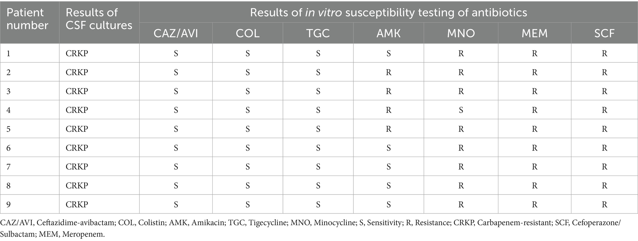The Infectious Diseases Society of America (IDSA) guidelines recommend over 4 weeks of treatment for CRKP-induced meningitis. However, the specific treatment duration should be determined according to the severity of the infection and the clinical response of patients (14). In the present study, antibiotics were discontinued when the CNS infection-related symptoms and signs disappeared and the CSF cultures (negative for at least three consecutive CSF cultures, with an interval of over 24 h) and the radiographic findings were normal. Apart from antibiotic use, it was equally important to remove the intracranial implants if the patients were infected (14). Given the blood–brain barrier’s limitations in treating CNS infections, local antibiotic administration, whether intraventricular or intrathecal, has attracted attention as an adjunct to intravenous therapy. The success of intraventricular polymyxin B and amikacin in the present study is consistent with previous reports, where these antibiotics were used to treat infections that did not respond to systemic therapy (16, 24). Despite the promising results, only 7 out of 9 patients in this cohort received intrathecal or intraventricular antibiotics, demonstrating a potential gap in treatment optimization. The absence of serious neurotoxicities or kidney impairment in our cohort suggests that these treatments are safe when closely monitored.