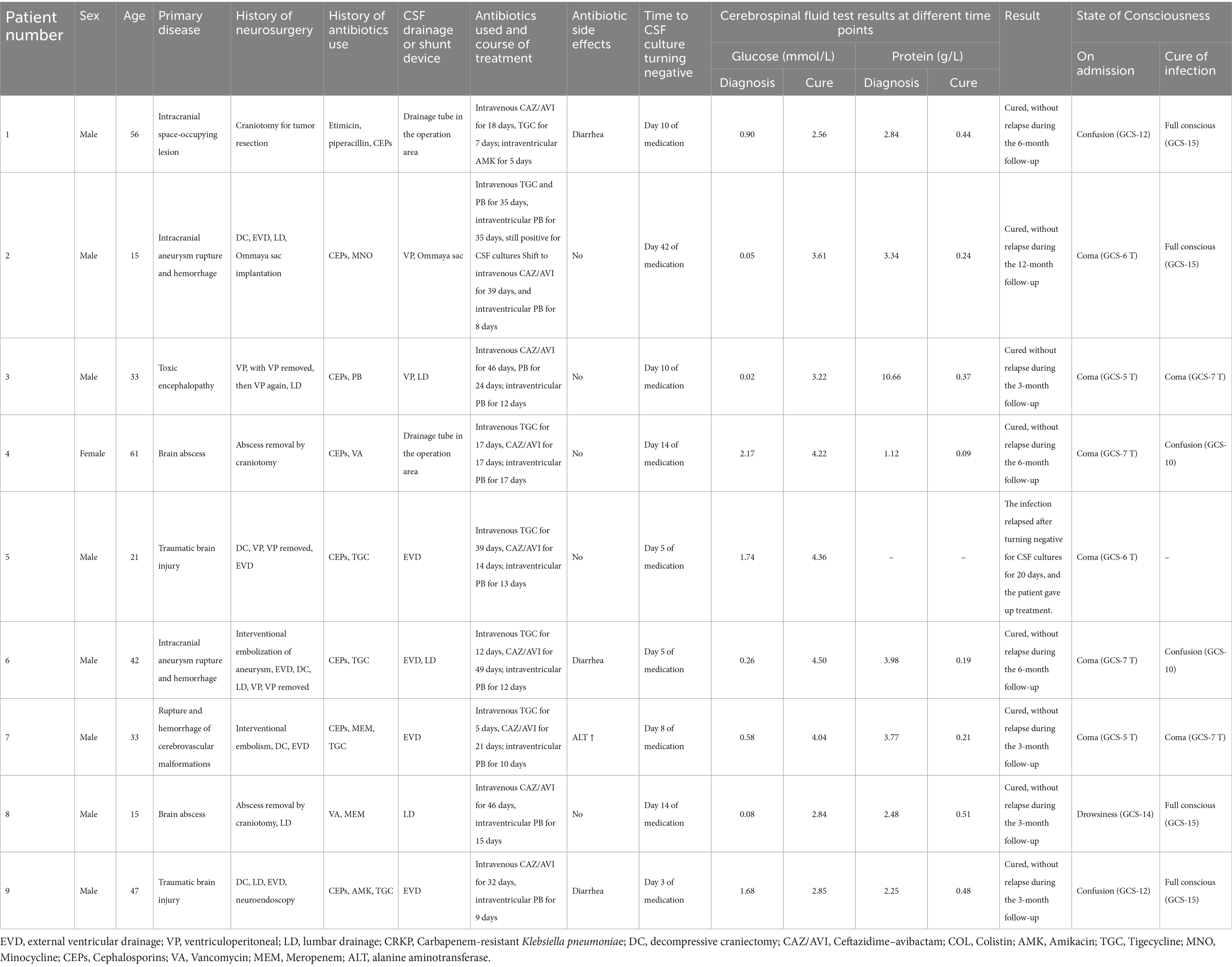 Central nervous system (CNS) infections caused by carbapenem-resistant Klebsiella pneumoniae (CRKP) have emerged as a significant and life-threatening public health concern, owing to their increasing prevalence and associated mortality (1). The selection of appropriate antibiotics is crucial for optimizing treatment outcomes in these infections. However, the therapeutic options are severely limited due to the challenges posed by the blood–brain barrier and the growing prevalence of bacterial drug resistance (2). Ceftazidime-avibactam (CAZ/AVI) is a combination of the third-generation cephalosporin ceftazidime and the synthetic β-lactamase inhibitor avibactam, which has been demonstrated to be effective in treating complicated urinary tract infections, intra-abdominal infections, and hospital-acquired pneumonia caused by Gram-negative bacilli (3). The growing body of evidence supporting the efficacy of CAZ/AVI in treating CRKP-induced CNS infections is reflected in several case reports (2–6), particularly those by Qing et al. (5) and Zhang et al. (6), further demonstrating the potential of CAZ/AVI in managing such infections. In this study, medical records were reviewed for 9 patients with CRKP-induced CNS infections who were treated with CAZ/AVI at the CSF Neurosurgery Department of the Aviation General Hospital. Clinical features, diagnostic and treatment protocols, patient outcomes, and prognosis were analyzed to provide guidance for the management of similar cases. This study presented a case series involving a small cohort of 9 patients, demonstrating the limited availability of data on the management of CRKP-induced CNS infections. While the treatment protocol described has shown promising results, it is crucial to interpret these findings in the context of the limited sample size and the retrospective design of the study. Furthermore, a comprehensive review of the existing literature on this topic has been included to contextualize the findings of this case series within the broader scope of available treatments for similar infections.
