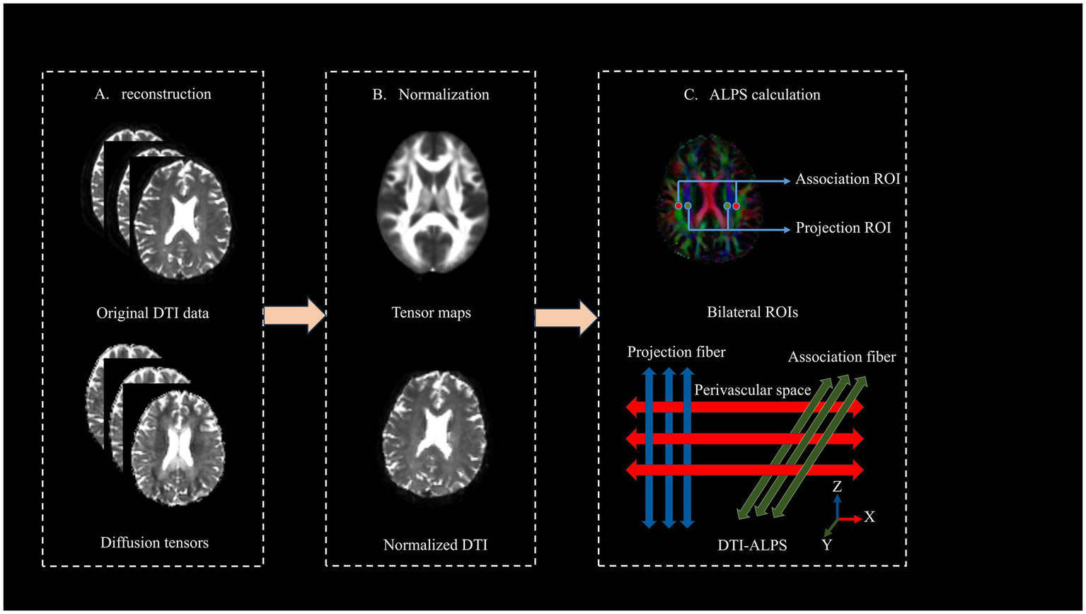 The DTI-ALPS method quantifies glymphatic system activity by measuring multidirectional diffusivity maps (12, 24). An ALPS index approaching 1 indicates either minimal perivascular water diffusion influence or severe glymphatic dysfunction. Higher index values reflect better glymphatic system functionality.