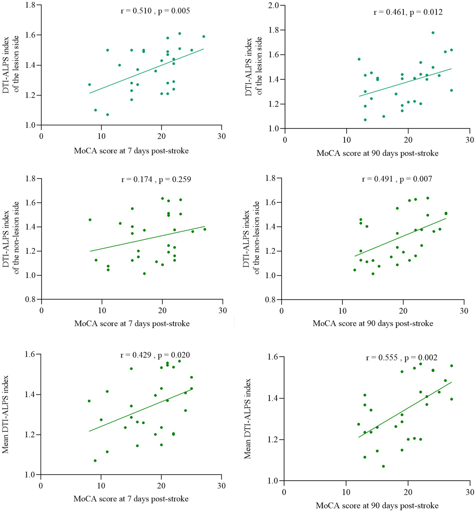 After adjusting for education and cerebrovascular risk factors (hypertension, diabetes, and atrial fibrillation), partial correlation analysis revealed the ALPS index of lesion side showed significant positive correlations with MoCA score both 7 days (r = 0.510, p = 0.005) and 90 days after stroke (r = 0.461, p = 0.012). The ALPS index of non-lesion side demonstrated a positive correlation with MoCA scores after stroke at 90 days (r = 0.491, p = 0.007) but no significant association with 7 days scores (r = 0.174, p = 0.259); The mean bilateral ALPS index positively correlated with both post stroke at 7 days (r = 0.429, p = 0.020) and 90 days MoCA scores (r = 0.555, p = 0.002) (Figure 4).