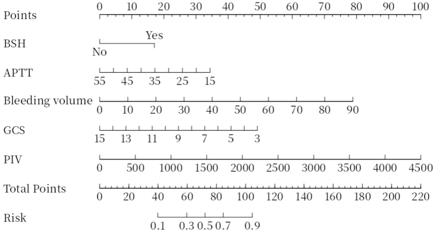Univariate logistic regression analysis revealed that brainstem hemorrhage, leukocytosis, neutrophilia, monocytosis, decreased total cholesterol, decreased LDL, surgery, decreased activated APTT, elevated blood glucose, large hemorrhage volume, low GCS score, and high PIV level were associated with poor prognosis in ICH patients (all p < 0.05). These variables were subsequently included in a multivariate logistic regression analysis. Given that neurosurgical intervention is typically considered only for patients with severe clinical conditions, this variable was excluded from the nomogram construction to minimize potential bias (Table 2). The results indicated that brainstem hemorrhage (OR = 3.17, 95% CI = 1.80–5.59, p < 0.01), decreased APTT (OR = 0.94, 95% CI = 0.89–0.99, p = 0.047), large bleeding volume (OR = 1.06, 95% CI = 1.04–1.09, p < 0.01), low GCS score (OR = 0.76, 95% CI = 0.70–0.82, p < 0.01), and high PIV level (OR = 1.01, 95% CI = 1.01–1.01, p < 0.01) were independent risk factors for poor prognosis in ICH patients (Table 3).