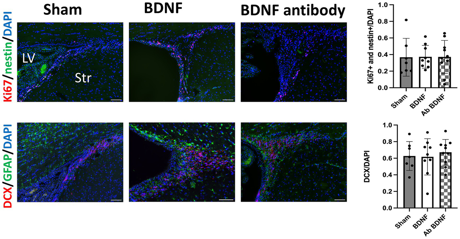This study has several limitations. First, the size of the hematoma in the striatum after ICH was not measured, which could influence the analysis. However, the average functional score on the first day after ICH was similar across all groups (p = 0.56), suggesting a consistent model for evaluating recovery. Second, the study only examined outcomes at 14 days post-ICH, focusing on the acute phase. A longer-term study is needed to assess outcome changes over time. Third, BDNF activity and signaling are influenced by sex hormones, particularly estrogen, which can increase the expression of BDNF and its receptor TrkB. This hormonal regulation results in differences in BDNF function and potentially neurogenesis between males and females. However, most previous studies in this field have traditionally used male rats to minimize variability caused by hormonal cycles in females. Our experiment focuses specifically on neurogenesis following ICH, and investigating sex differences is beyond the scope of this study. It is important to note that documented differences exist between male and female rats in BDNF expression and its effects on neurogenesis, primarily due to variations in baseline BDNF levels and hormonal modulation. These differences should be taken into account when interpreting results or designing future experiments involving BDNF and neurogenesis. Fourth, our data have limitations in addressing whether intraventricular BDNF affects endogenous BDNF expression, which may be an important factor influencing BDNF’s neuroprotective effects. In our previous work, we quantitatively compared endogenous BDNF (precursor and mature forms) in the striatum and cortex between sham and post-ICH day 7 rats using western blot (10). No significant difference was observed. Additionally, we noted increased CSF BDNF at post-ICH day 7 compared to sham. Additionally, we noted increased CSF BDNF at post-ICH day 7 compared to sham (10). Accordingly, our data primarily address the effects of exogenous BDNF on the bilateral SVZ. Lastly, an outlier was excluded from the BDNF-treated group, which may introduce a Type I error. We should cautiously interpret the beneficial effects of BDNF treatment based on our results, and further large-scale studies may be needed to support this notion.