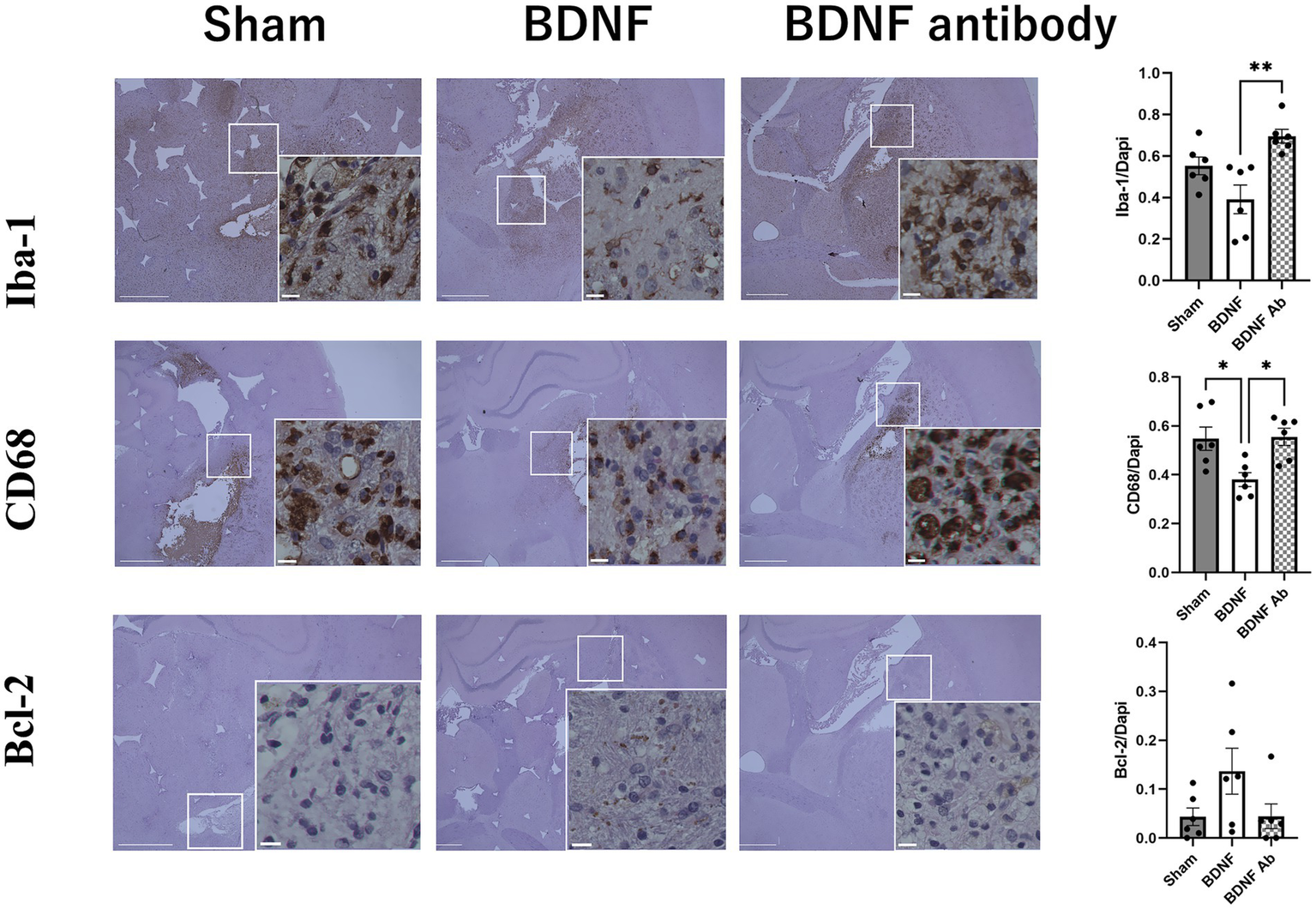 Intraventricular administration of BDNF ameliorated neuroinflammation in the perihematomal area 14 days post-ICH. The BDNF infusion group exhibited lower levels of Iba-1expression compared to the sham group (p = 0.09) and the BDNF ab group (p = 0.002) as shown in the upper row. Additionally, the BDNF infusion group demonstrated significantly reduced CD68 expression compared to the sham group (p = 0.02) and the BDNF ab group (p = 0.01) as shown in the middle row. On the otherhand, Intraventricular administration of BDNF showed no significant effect on apoptotic activity, as the percentage of Bcl-2-positive cells (an anti-apoptotic marker) showed no significant differences between the BDNF group and either the sham or anti-BDNF groups (both p = 0.14) (lower row) Scale bars represent 100 μm in the original image and 25 μm in the magnified image. Sample size: n = 6 for all groups.