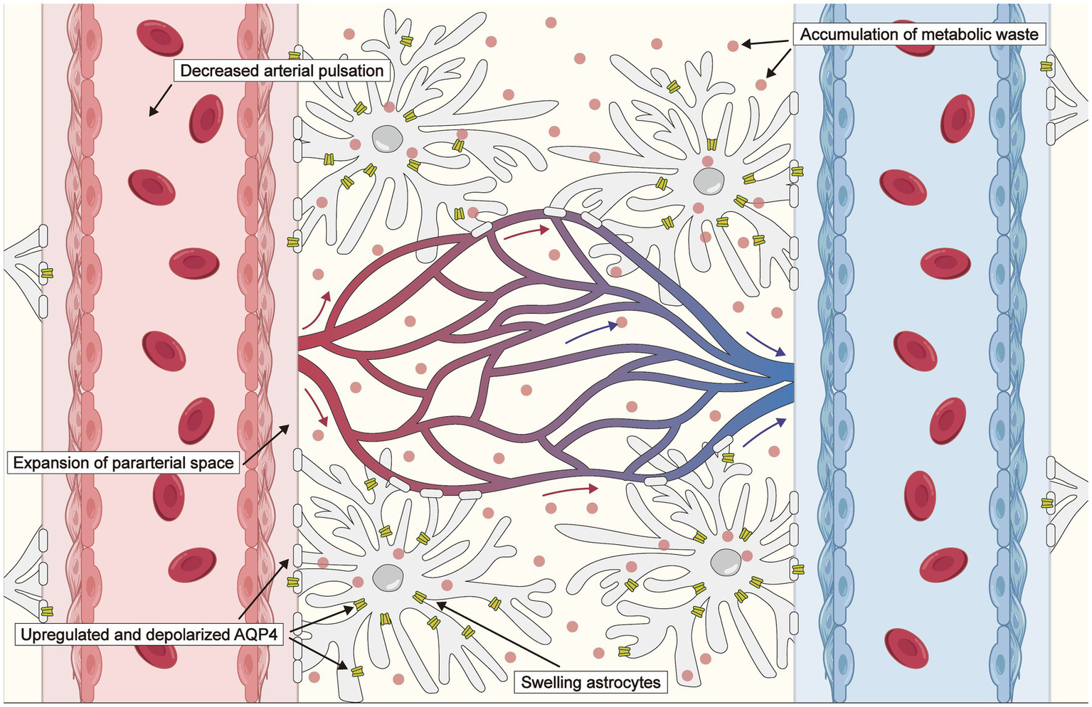 Schematic of changes in the glymphatic system after an ischemic stroke. The driving force is reduced due to decreased arterial pulsation following an ischemic stroke. Expansion of the para-arterial spaces facilitates an influx of cerebrospinal fluid (CSF) toward the interstitium, which is associated with exacerbated cytotoxic edema. Aquaporin 4 (AQP4) distribution transfers from the perivascular endfeet to the entire astrocytic membrane, and AQP4 expression is upregulated, impairing the clearance of CSF, metabolites, and inflammatory cytokines.
