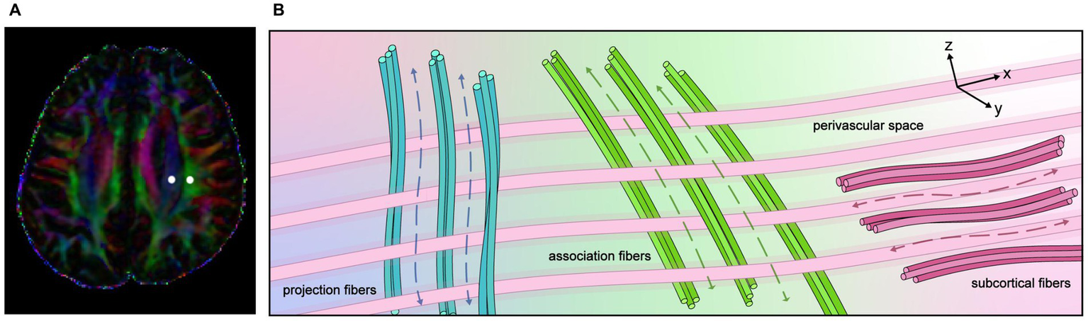 Although numerous studies have demonstrated an association between the DTI-ALPS index and various neurological disorders, including stroke, Alzheimer’s disease, Parkinson’s disease, and small vessel diseases (15, 16, 87, 89, 92, 93), the validity of the DTI-ALPS index as a reliable marker of glymphatic brain clearance remains questionable. Manual placement of the region of ROI remains one of the primary limitations of the DTI-ALPS method, as it is susceptible to subjective interpretation and arbitrary decision-making (84). Therefore, standardizing the criteria for ROI placement is essential to minimize variability among observers. Furthermore, the observed association should not be equated with causality because several factors, such as patient motion and blood flow dynamics, may exert a significant influence. In addition, spatial resolution, the specificity of diffusivity metrics, and confounding factors such as white matter pathology and age may influence the interpretation of the DTI-ALPS index. The spatial resolution achievable with normal DTI is far larger than that of tissue structures, including the PVS. The ROIs for calculating the DTI-ALPS index include not only the medullary vessels and PVS but also the surrounding white matter (84, 94). Therefore, it is not possible to evaluate only the diffusivity of the PVS along the medullary vessels. The spatial resolution of standard DTI is insufficient to resolve small structures such as the PVS. Given that the ROIs used to calculate the DTI-ALPS index encompass not only the medullary vessels and PVS but also the surrounding white matter, it is not feasible to selectively assess the diffusivity of the PVS along the course of the medullary vessels. Thus, it is crucial to enhance the resolution and accuracy of DTI imaging protocols to capture the PVS and its associated diffusion dynamics more effectively. Iliff et al. (21) initially described the glymphatic system in vivo, and then subsequently employed two-photon laser scanning microscopy to visualize the movement of fluorescent dextrans injected intracisternally from the surface into the cerebral cortex, with very limited penetration into the deep cerebral white matter. This technique offers the benefit of enabling direct visualization of the brain parenchyma but only near the surface of the brain. A subsequent study utilizing intrathecal gadobutrol injection as a CSF tracer corroborated this finding, demonstrating minimal or nonexistent tracer enhancement within regions of deep white matter (95). Multiple functions of the waste elimination system of the brain have been elucidated across distinct anatomical locales. The major problem with the DTI-ALPS method is that it is currently limited to evaluating white matter outside the lateral ventricles, where the medullary arteries and veins intersect with the ventricular wall. The phenomena observable using the DTI-ALPS method are only a fraction of waste clearance in the human brain. It is unlikely using the DTI-ALPS method to characterize the function of the entire glymphatic system. Thus, the relationship between the DTI-ALPS index and glymphatic function must be interpreted with caution. It is advisable to denote a reduced DTI-ALPS index as such, rather than directly attributing it to glymphatic dysfunction, in order to avoid inaccurate characterization of the underlying pathophysiology (84). Recently, four-dimensional flow MRI (4D flow MRI) has emerged as a powerful imaging technique that can acquire a large amount of volumetric fluid velocity data with high spatiotemporal resolution. The studies in this domain, which are aimed at characterizing the flow dynamics of CSF, are not only of great significance for clarifying the normal physiological functions of the brain and spinal cord but are also crucial for exploring neurological diseases involving dysfunctions such as impaired clearance of brain metabolic waste (96). Accordingly, integrating diverse methodological approaches is essential for a comprehensive assessment of the glymphatic system, with the anticipated requirement that these methods be applied complementarily in future studies.