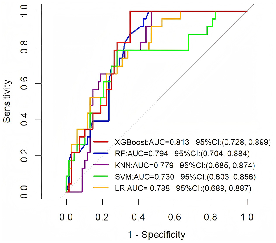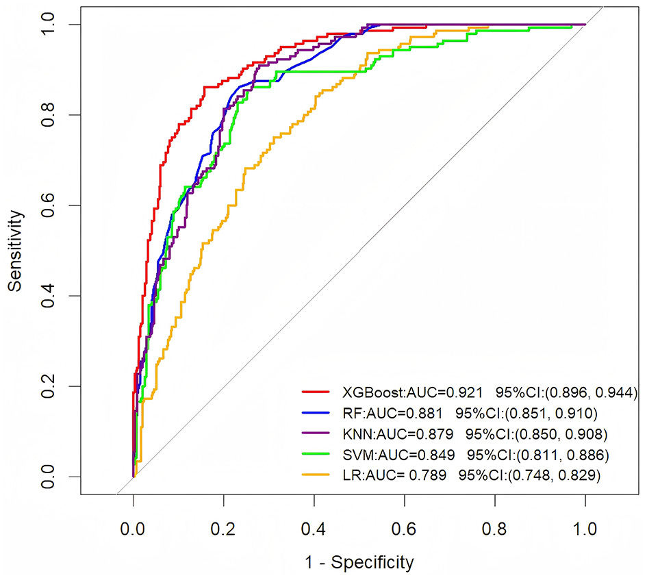 Using the training set data, we constructed five predictive models: XGBoost, RF, LR, SVM, and KNN. The training set was employed for training the models and performing hyperparameter tuning. We used a five-fold cross-validation approach on the training set to optimize model parameters during the development phase. The test set and the external validation set remained completely independent and were used only once after model selection and training were completed. This ensures an unbiased assessment of the model's generalization performance. The AUC values of the five ML models based on the training set are 0.921, 0.881, 0.789, 0.849, and 0.879, respectively (Figure 1). The XGBoost model demonstrated superior predictive accuracy, achieving an AUC of 0.921 (95% CI: 0.896–0.944), while the LR model showed relatively weaker performance (AUC = 0.789, 95% CI: 0.748–0.829).