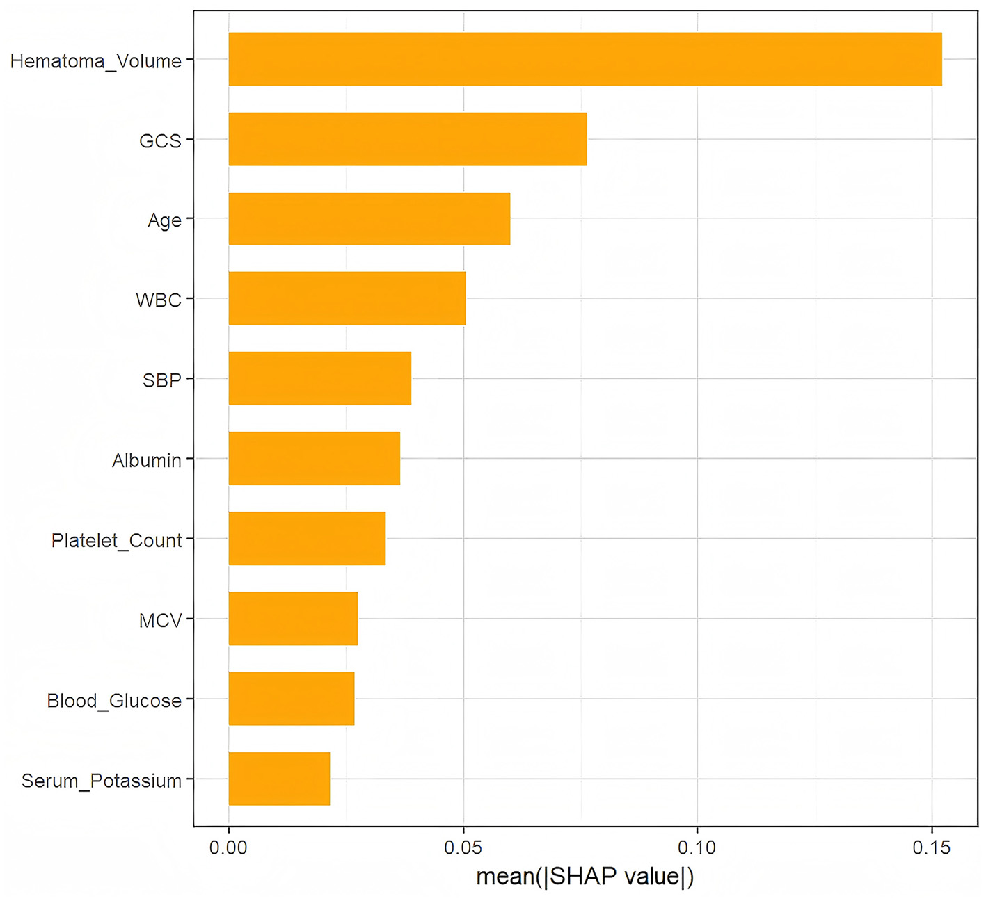 As depicted in Figure 4, Hematoma Volume emerged as the most influential predictor of prognosis, followed by GCS, WBC, Age, Albumin, and SBP. Figure 5 further elucidates the directional impact of each variable. Positive SHAP values (right side, orange) indicate features that increase the probability of poor prognosis, while negative values (left side, purple) suggest a reduced risk. Hematoma Volume showed a strong positive association with poor prognosis, with high values (orange) correlating with increased risk. Conversely, higher GCS scores (left side, orange) were linked to better outcomes, as indicated by negative SHAP values. For instance, larger hematoma volumes (right side, orange) were associated with poorer prognoses, whereas higher GCS scores (left side, orange) predicted better outcomes compared to lower scores (right side, purple).