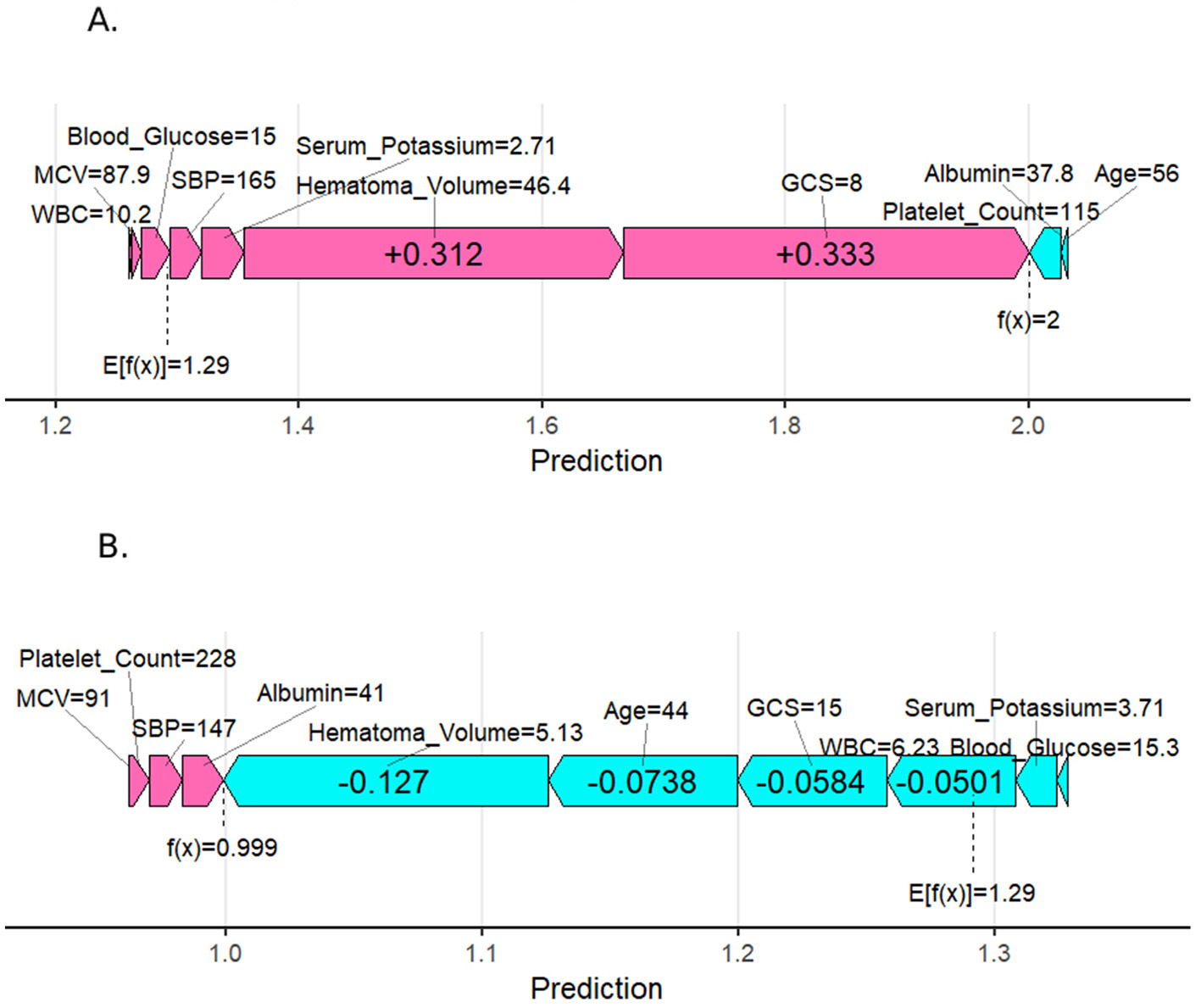 Figure 6 presents individual SHAP force diagrams for two patients: one with a poor prognosis (A) and one with a good prognosis (B). The model's base value (E[f(x)] = 1.29) represents the initial predicted value in the absence of feature inputs. The individual predictive value (f(x)) quantifies deviations from the base value using a logarithmic odds ratio, reflecting the cumulative effect of clinical characteristics on prognosis. In the diagram, red arrows denote risk-enhancing features, while blue arrows denote risk-suppressing features. The arrow length corresponds to the magnitude of the feature contribution. For Patient A (poor prognosis), high-risk features such as large hematoma volume (46.4 mL), low GCS score (8 scores), and metabolic abnormalities (e.g., blood glucose 15 mmol/L) collectively elevated the predictive value (f(x) = 2.0) above the baseline, strongly indicating adverse outcomes. Conversely, for Patient B (good prognosis), protective features dominated, driving the predictive value (f(x) = 0.999) below the baseline.