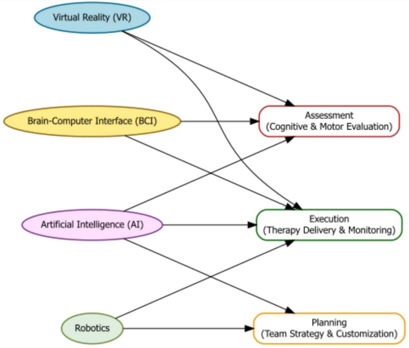 Flowchart illustrating how emerging technologies—Virtual Reality (VR), Brain-Computer Interfaces (BCI), Artificial Intelligence (AI), and Robotics—contribute to the assessment, planning, and execution phases of moderate-to-severe TBI rehabilitation.