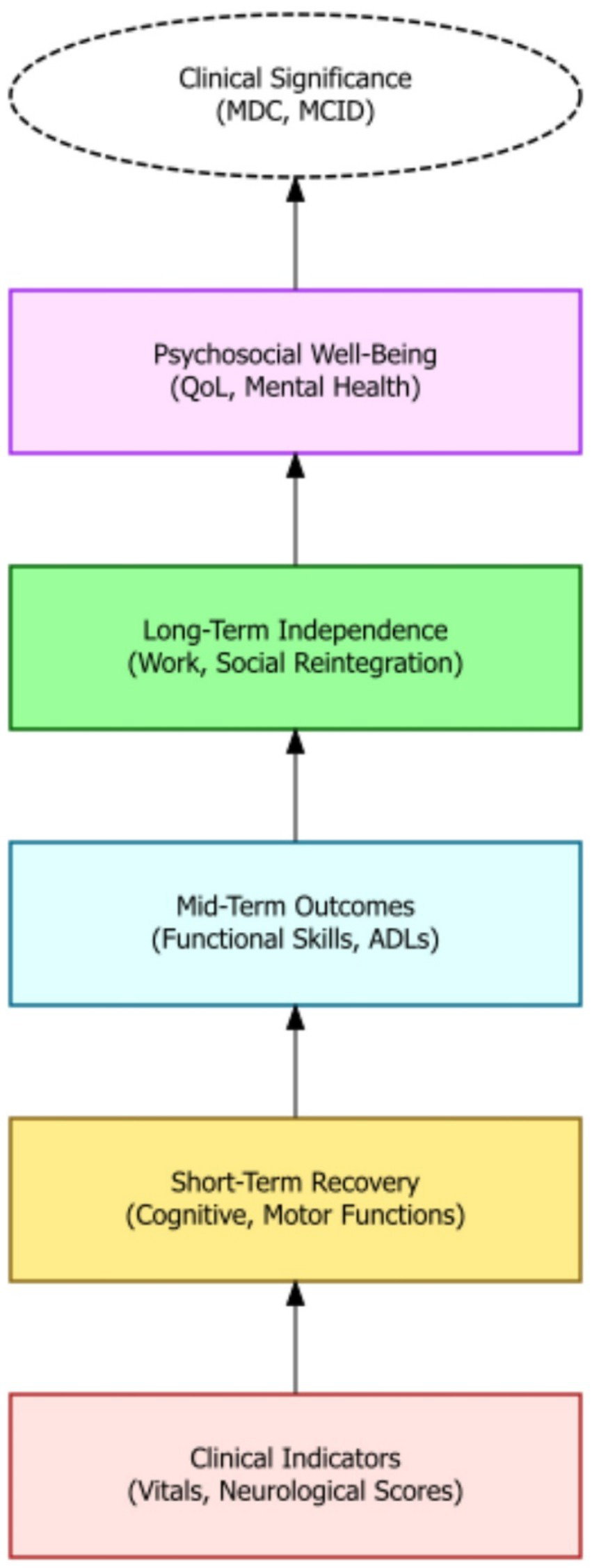 A hierarchical outcome model showing the progression from clinical indicators to long-term psychosocial wellbeing in moderate-to-severe TBI recovery. The framework emphasizes layered evaluation—from short-term recovery to reintegration and quality of life—culminating in clinically significant thresholds such as MDC and MCID.