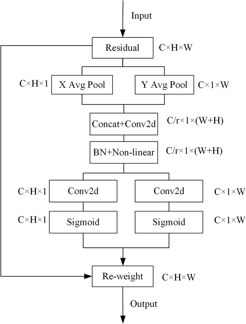 The Fused-MBConv (Fused Mobile Inverted Bottleneck Convolution) was a simplified and efficient variant of the standard MBConv block, introduced in EfficientNetV2 (17). Unlike MBConv, which used a sequence of expansion (1 × 1 convolution), depthwise convolution (3 × 3), and projection (1 × 1 convolution), the Fused-MBConv eliminated the depthwise convolution and merged the expansion and spatial filtering into a single 3 × 3 regular convolution. This design reduced memory access cost and improved computational efficiency, especially in the early layers where input resolution was high. In our study, we replaced the squeeze and excitation (SE) attention block contained in the MBConv module in EfficientNetV2 with a coordinate attention (CA) block to optimize the network structure. CA utilizes two one-dimensional global pooling operations to aggregate the vertical and horizontal input features into two independent direction-aware feature maps, and then encodes the two feature maps with embedded direction-specific information into two attention maps. Each attention map captures the long-range dependencies of the input feature maps along one spatial direction. Therefore, positional information could be saved in the generated attention map, and the attention maps of two independent directions were applied to the input feature map by multiplication to emphasize the representation of interest. In our study, global pooling was transformed into an encoding operation of two 1D vectors. For input X, the pooling kernels (H, 1) and (1, W) were used to encode the horizontal and vertical features, and the output of the c-th dimensional feature was: