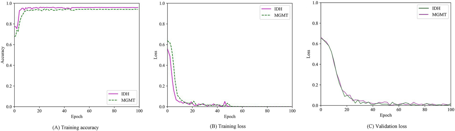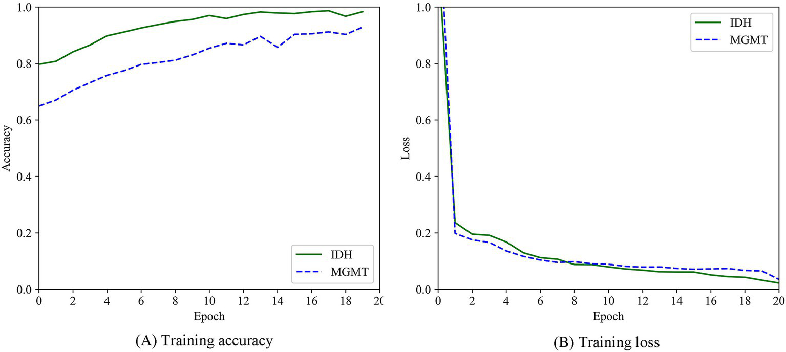 Glioma is the most common primary malignant brain tumor of the central nervous system in adults, with an annual incidence of approximately 6 per 100,000 persons (1). It can be classified into grades II-IV according to the World Health Organization (WHO). With the introduction of the 2016 revised WHO Classification of Tumors of the Central Nervous System (CNS) (2), molecular biomarkers have become increasingly important for the diagnosis and prognosis of glioma. The latest 2021 WHO classification (3) emphasizes the importance of genetic changes, such as isocitrate dehydrogenase (IDH), in the classification of gliomas. IDH mutant patients have better treatment outcomes and overall survival than the IDH wild patients (4). O6-methylguanine-DNA methyltransferase (MGMT) is also an important prognostic marker for glioma patients (5). MGMT promoter methylation can suppress the activity of MGMT, which is a DNA repair enzyme and can blunt the therapeutic effect of alkylating chemotherapy. Glioma patients with MGMT promoter methylation are more sensitive to chemotherapy and have longer survival time (6). Identification of the status of critical molecular biomarkers for glioma patients at high risk of early progression is critical for personalized treatment planning.