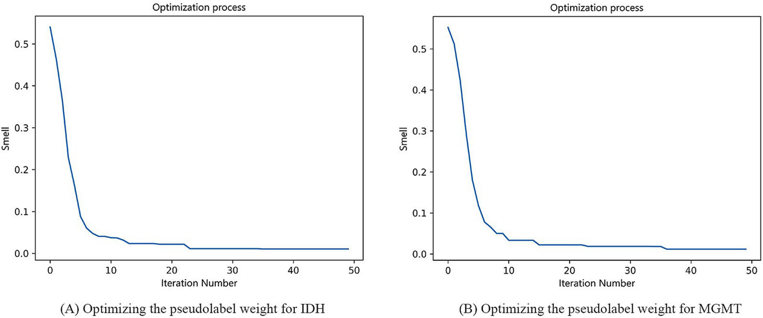In our study, the weight of the labeled data was fixed at 1, and the weight of the pseudolabeled data was adjusted by the FOA. In the optimization process using the FOA, the population size was set to 5, the maximum number of iterations (MaxGen) was set to 50, the radius (R) was set to 1, and the number of optimization variables (D) was set to 1. When the flavor concentration reached the optimal value, the optimization was over. The process of optimizing the pseudolabel weight for IDH mutation and MGMT methylation was shown in Figure 6. For IDH mutation, when the final taste concentration was 0.0104, and the weight of the pseudolabel data reached the optimal value of 0.17. For MGMT methylation, when the final taste concentration was 0.0118, the weight of the pseudolabel data reached the optimal value of 0.12.
