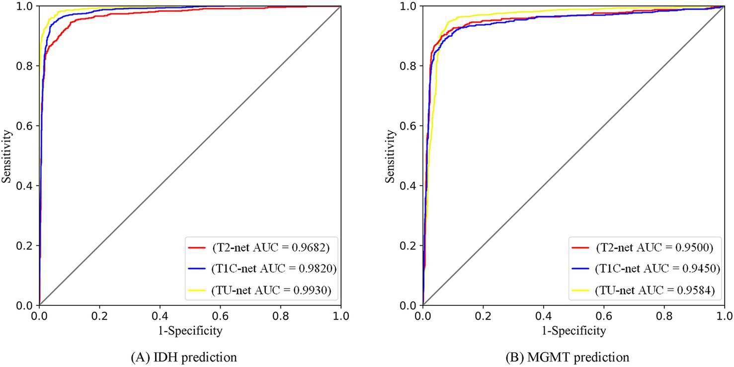 The proposed framework demonstrated high performance in predicting both IDH mutation and MGMT promoter methylation status. Among the three subnetworks, TU-net achieved the best results, with accuracies of 0.9598 for IDH and 0.9269 for MGMT, and AUCs of 0.9930 and 0.9584, respectively. Comparative analysis showed that our proposed model outperformed other convolutional neural network (CNN) - based approaches.