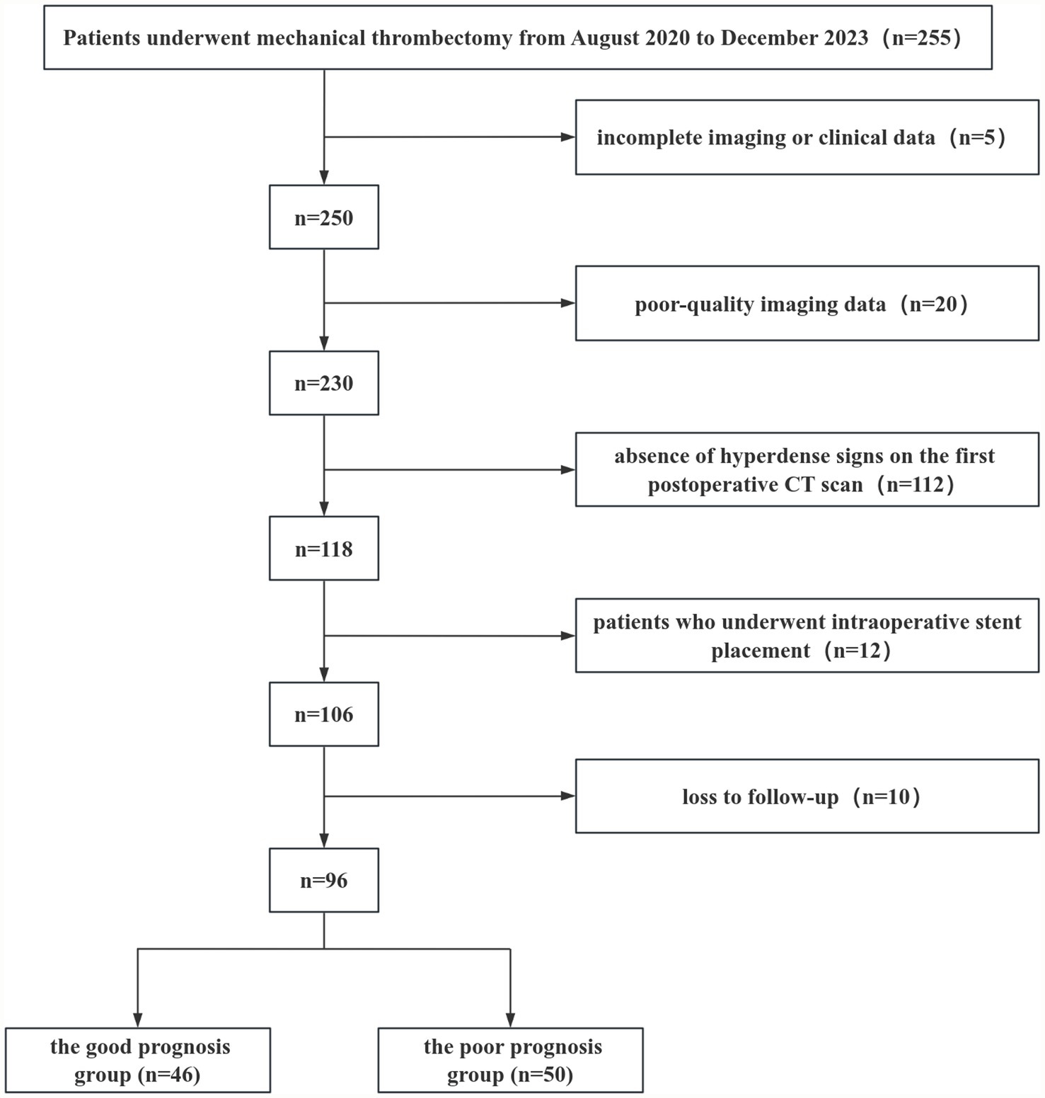 A retrospective study was conducted on 96 consecutive patients with acute ischemic stroke who underwent mechanical thrombectomy at The Affiliated Yongchuan Hospital of Chongqing Medical University and presented with hyperdense signs on their first postoperative CT scan. The patients were divided into a training set (n = 55, treated between August 2020 and March 2022) and a validation set (n = 41, treated between November 2022 and December 2023) for temporal validation of the predictive model. Of these, 61 patients (63.54%) were male and 35 (36.46%) were female, with ages ranging from 32 to 101 years (mean age: 66.38 ± 11.58 years). The enrolled patients were followed up and classified into a good prognosis group (mRS 0–2) and a poor prognosis group (mRS 3–6) based on the 90-day postoperative modified Rankin Scale (mRS) score, where a score of 6 indicated death. Inclusion criteria included: (i) Age ≥ 18 years; (ii) Confirmed large-artery occlusion based on computed tomography angiography (CTA), magnetic resonance angiography (MRA), or digital subtraction angiography (DSA). Exclusion criteria included: (i) Incomplete imaging or clinical data; (ii) Poor-quality imaging data; (iii) Absence of hyperdense signs on the first postoperative CT scan; (iv) History of intraoperative stent placement; (v) Loss to follow-up (Figure 1). This study was approved by the Ethics Committee of Yongchuan Hospital affiliated with Chongqing Medical University (No. 2024-41).