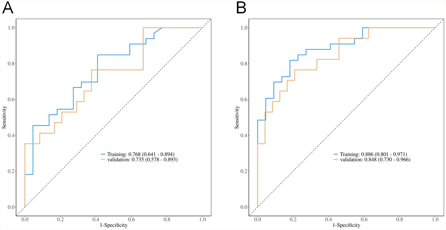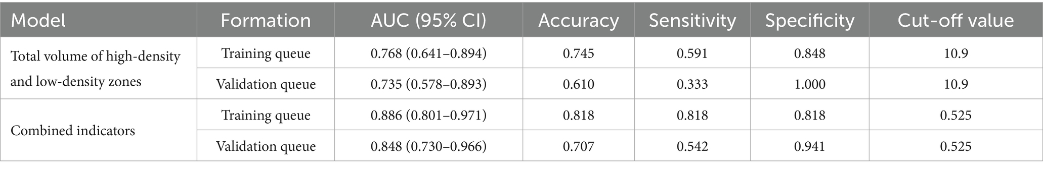ROC analysis demonstrated that the total volume of hyperdense and hypodense areas exhibited good predictive performance for 90-day poor prognosis in patients presenting with hyperdense signs on the first non-contrast CT scan after mechanical thrombectomy. The AUC was 0.768 (95% CI: 0.641–0.894) in the training set and 0.735 (95% CI: 0.578–0.893) in the validation set. A combined model incorporating vascular occlusion site, D-dimer level, admission diastolic blood pressure, preoperative NIHSS score, hyperdense volume, and total volume of hyperdense and hypodense areas achieved the highest predictive performance, with an AUC of 0.886 (95% CI: 0.801–0.971) in the training set and 0.848 (95% CI: 0.730–0.966) in the validation set (Table 4 and Figure 2).