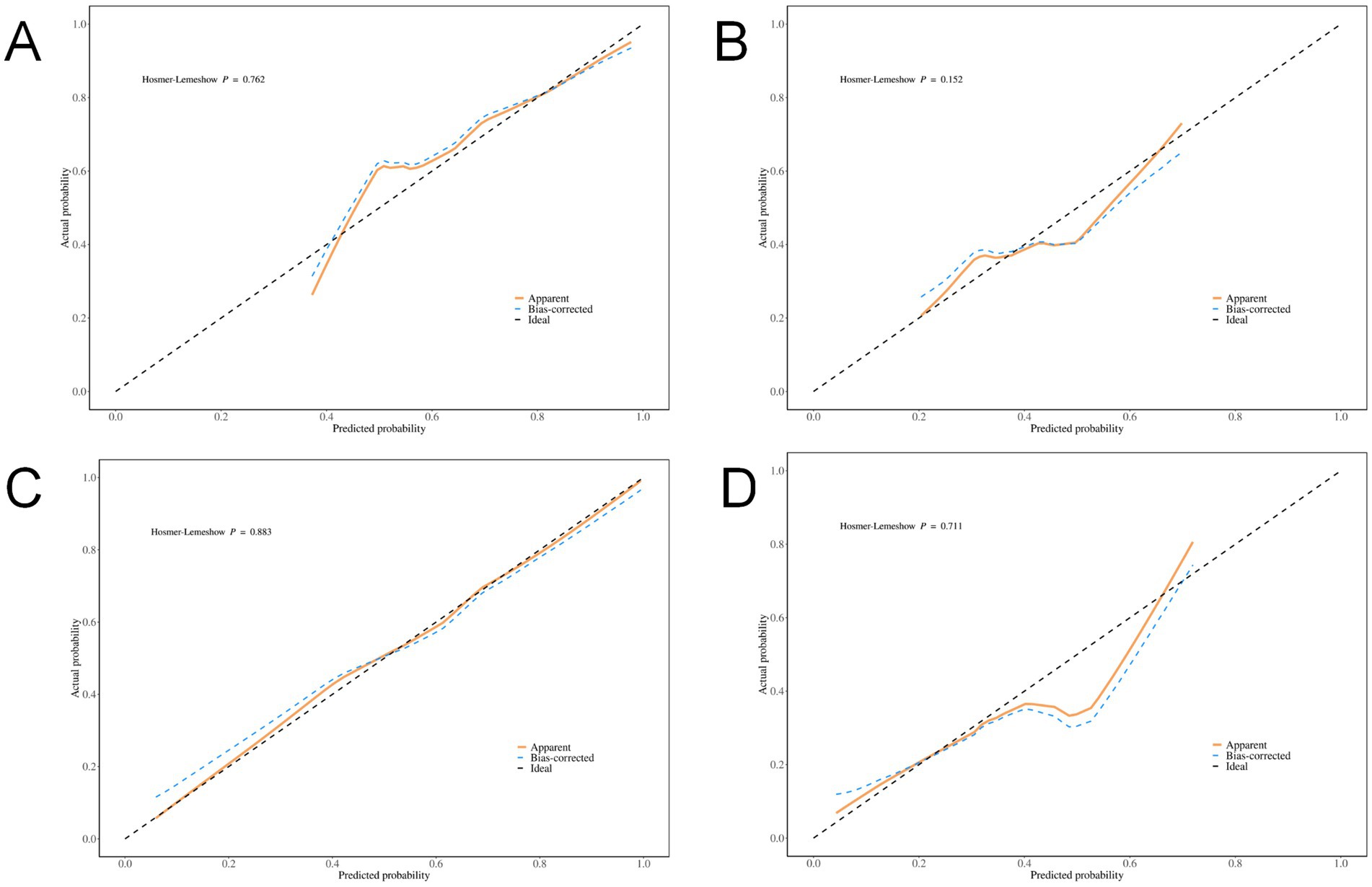 Figure 3. Calibration Curves. (A) Total volume of the training set; (B) Total volume of the validation set; (C) Combined diagnostic indicators of the training set; (D) Combined diagnostic indicators of the validation set.