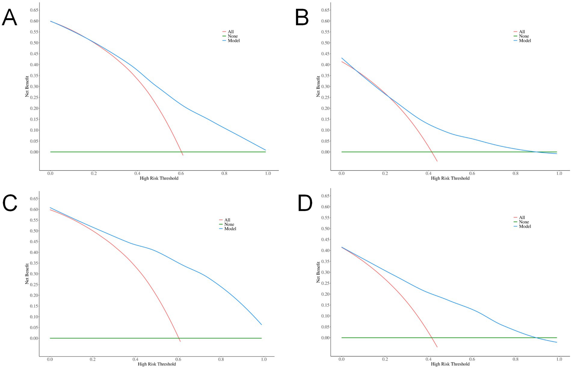 Figure 4. DCA curves. (A) Total volume in the training set; (B) Total volume in the validation set; (C) Combined indicators in the training set; (D) Combined indicators in the validation set.