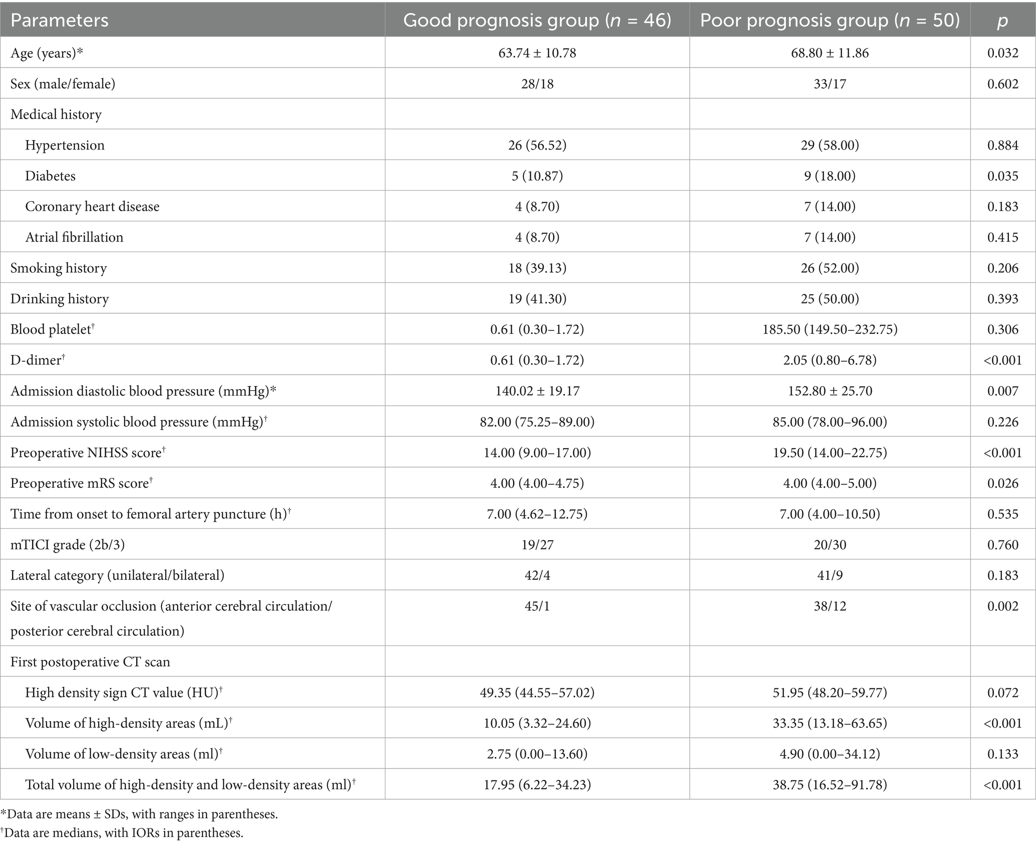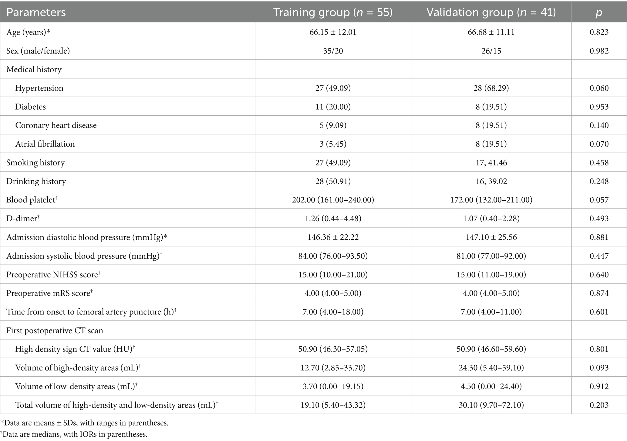 Among the 96 patients, 63 (65.6%) had MCA occlusion, 12 (12.5%) had internal carotid artery tandem middle cerebral artery occlusion, 8 (8.3%) had intracranial segment occlusion of the internal carotid artery, 5 (5.2%) had intracranial segment occlusion of the vertebral artery, and 8 (8.3%) had basilar artery occlusion. The good prognosis group comprised 46 patients, including 28 males and 18 females, with a mean age of 63.74 ± 10.78 years. The poor prognosis group comprised 50 patients, including 33 males and 17 females, with a mean age of 68.8 ± 11.86 years. Age, history of diabetes, admission diastolic blood pressure, preoperative NIHSS score, preoperative mRS score, D-dimer levels, volume of high-density areas, and total volume of high-density and low-density areas were significantly higher in the poor prognosis group compared to the good prognosis group (p < 0.05) (Table 1). Using the time period validation method, the enrolled patients were divided into a training group (n = 55) and a validation group (n = 41) in an approximate 1:1 ratio. No statistically significant differences were observed in clinical data between the two groups (Table 2).