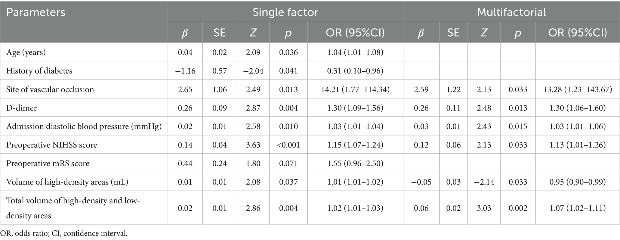 Statistically significant indicators from the good and poor prognosis groups were included in univariate logistic regression analyses. The results revealed that age, history of diabetes, site of vascular occlusion, D-dimer, admission diastolic blood pressure, preoperative NIHSS score, volume of high-density areas, and total volume of high-density and low-density areas were significant factors associated with poor prognosis in patients with combined hyperdense signs (p < 0.05). Multifactorial logistic regression analysis further demonstrated that site of vascular occlusion, D-dimer, admission diastolic blood pressure, preoperative NIHSS score, volume of high-density areas, and total volume of high-density and low-density areas were independent risk factors for 90-day poor prognosis in patients with combined hyperdense signs (p < 0.05) (Table 3).
