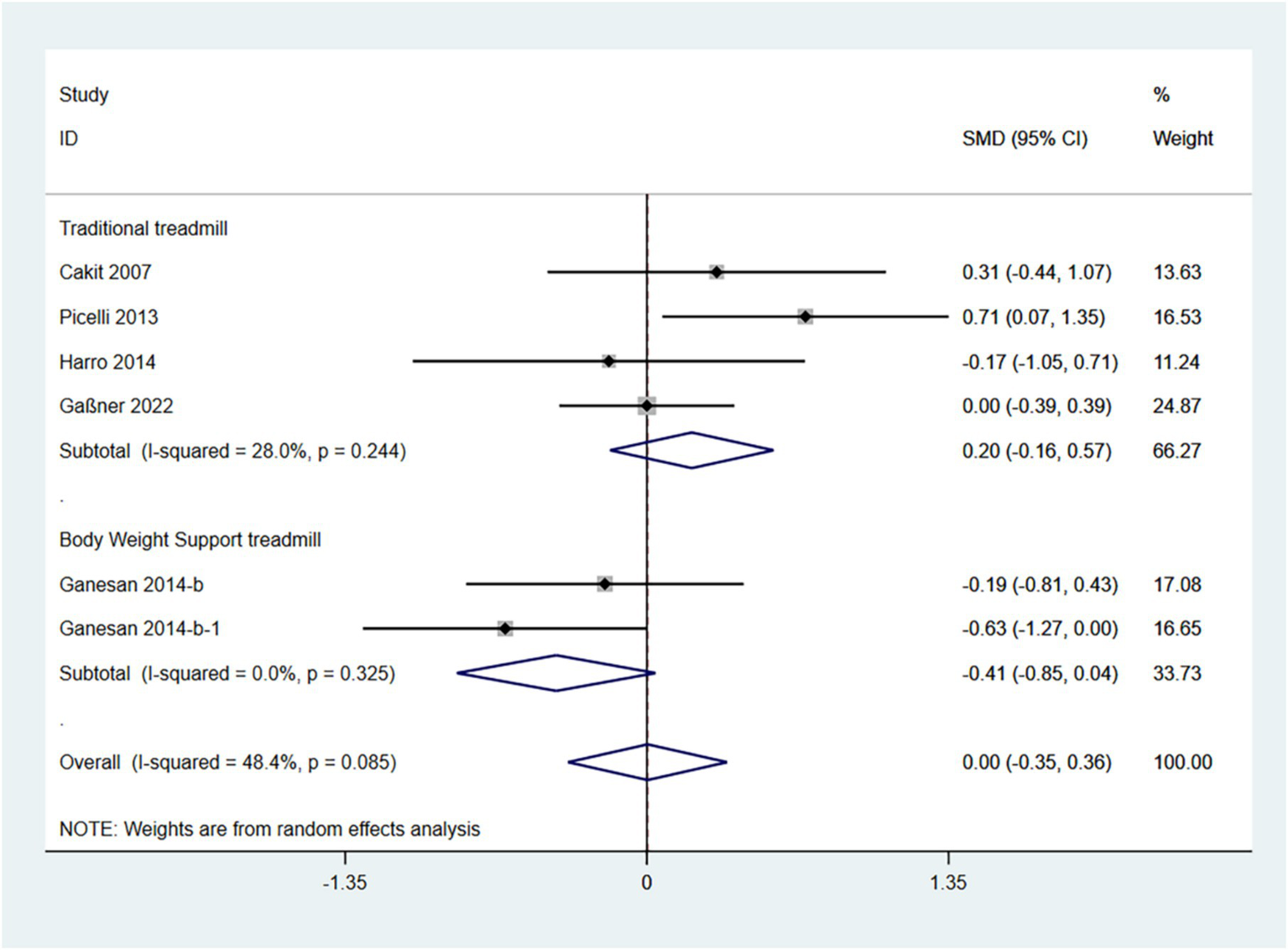 In the random effects model, treadmill training significantly reduced the degree of Parkinson’s symptoms compared to conventional training (SMD: -0.45; 95% CI: −0.73 to −0.17), but with greater heterogeneity (I2 = 80.2%, p = 0.003).