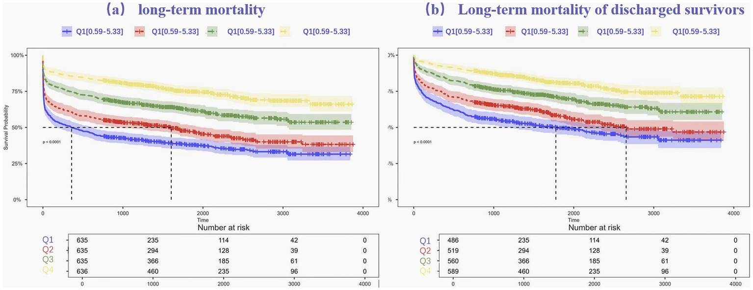 Long-term mortality, which was defined as all-cause mortality during the longest available follow-up period, was the primary outcome. The secondary outcome focused on long-term mortality among patients who were discharged alive. Follow-up mortality data were sourced from the Chinese household registration system, recognized for its high accuracy and reliability in maintaining death records.