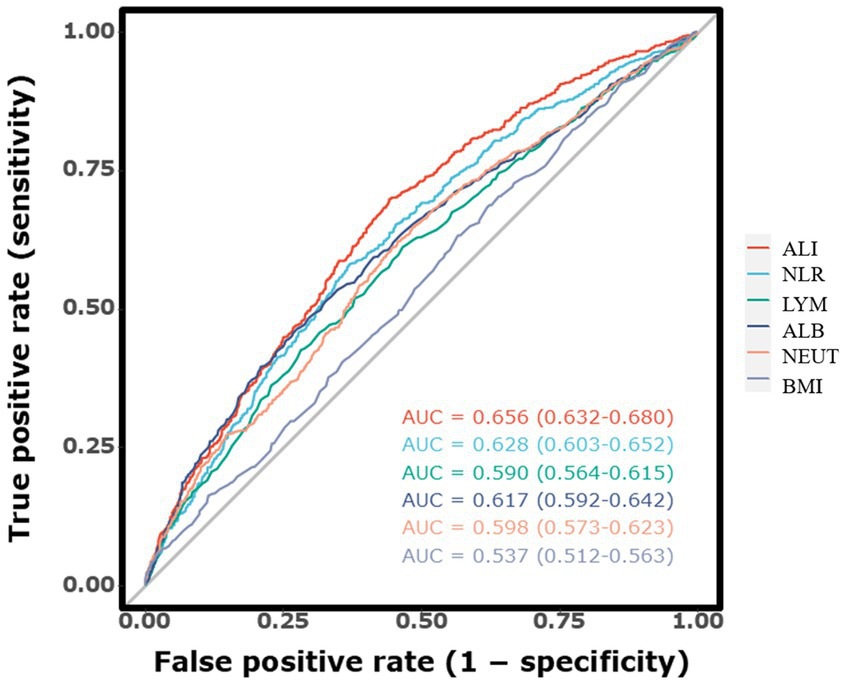 The discriminative ability of ALI and other inflammatory markers for predicting long-term mortality was evaluated using ROC curves, as illustrated in Figure 3. The AUC for ALI was 0.672 (95% CI, 0.651–0.693), indicating strong predictive accuracy for long-term mortality in ICH patients. In comparison, the AUC for NLR was slightly lower at 0.640 (95% CI, 0.619–0.662), suggesting that ALI is a more reliable predictor. Furthermore, the AUC values for individual indicators including lymphocyte count, neutrophil count, BMI, and serum albumin were also analyzed. The respective AUC values were lymphocyte count (0.587, 95% CI, 0.564–0.609), neutrophil count (0.617, 95% CI, 0.595–0.639), BMI (0.538, 95% CI, 0.516–0.561), and serum albumin (0.628, 95% CI, 0.606–0.650). Among all markers, ALI achieved the highest AUC, underscoring its modestly better predictive capability.