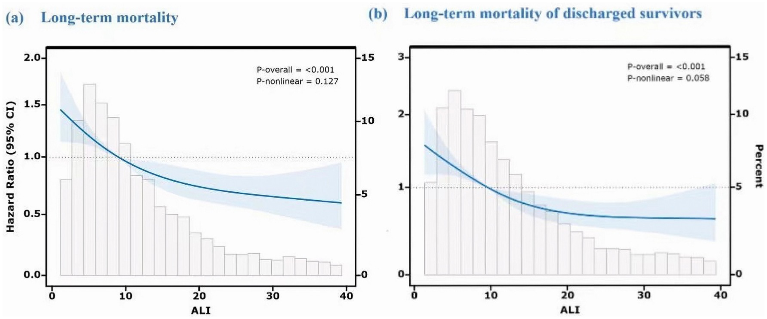 In order to investigate potential dose–response relationships between ALI and long-term mortality, RCS models were implemented. By incorporating four percentile-based knots of the ALI distribution, these models facilitated a detailed investigation of non-linear associations. To explore the relationship between ALI and prognosis, ALI values were categorized into quartiles and also dichotomized at the median. This approach enabled an exploratory assessment of risk gradients and allowed comparison of survival outcomes across ALI strata. While these data-driven thresholds do not necessarily correspond to clinically validated cut-offs, they provide initial insight into ALI’s discriminative capacity.